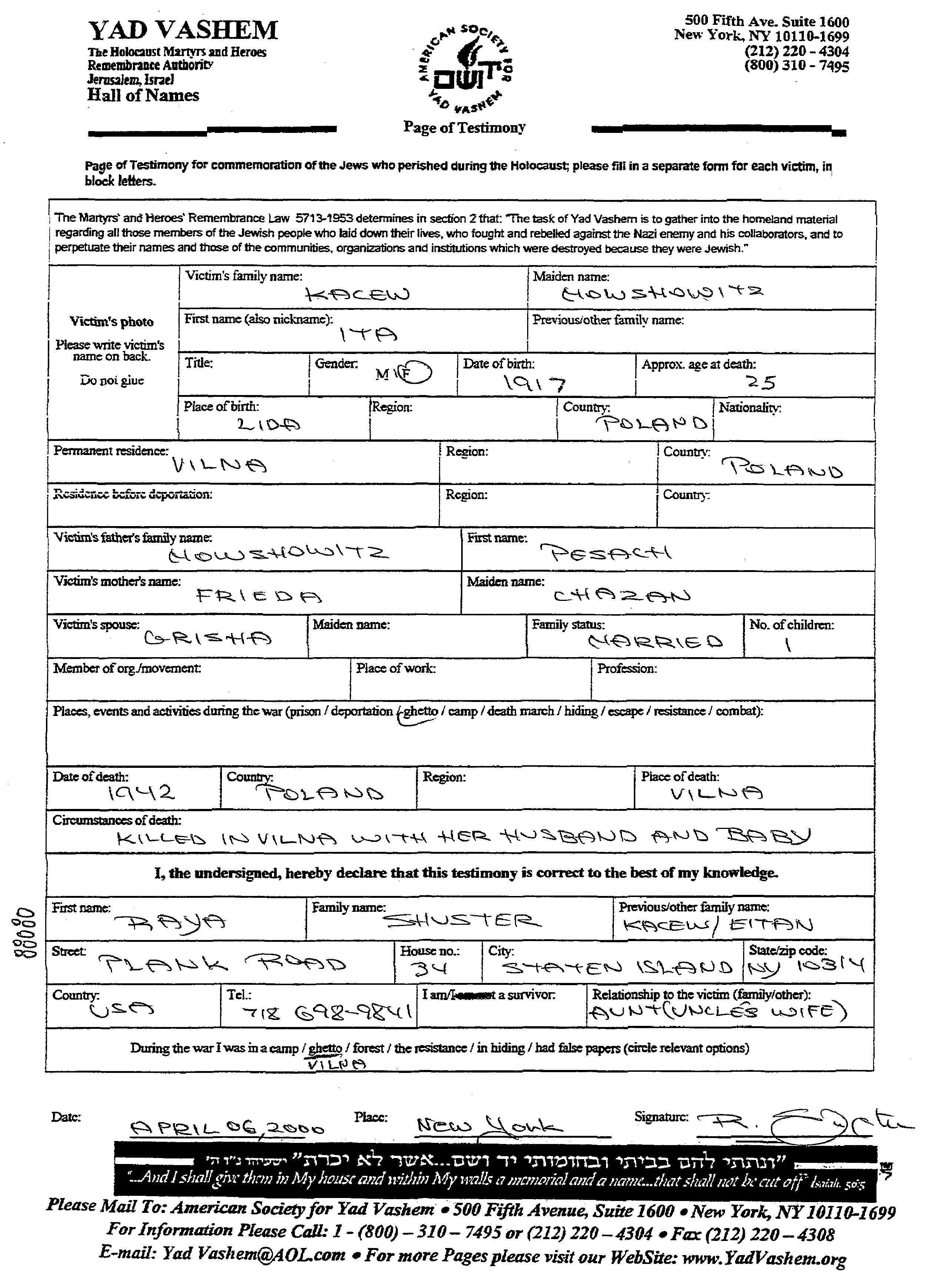 Ita Kacew, geb. Mowshowitz wurde im Jahr 1917 in Lida, Polen geboren. Sie war die Tochter von Pesach und Frieda. Sie war mit Grisha Verheiratet. Vor dem Zweiten Weltkrieg lebte sie in Vilna, Polen.