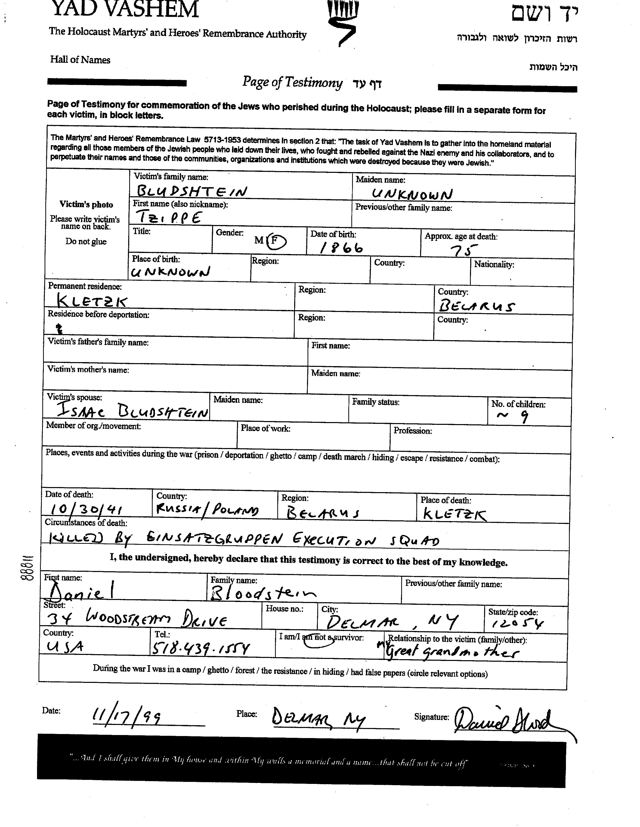 Tzippe Bludshtein wurde im Jahr 1866 geboren. Vor dem Zweiten Weltkrieg lebte sie in Kletsk, Polen.