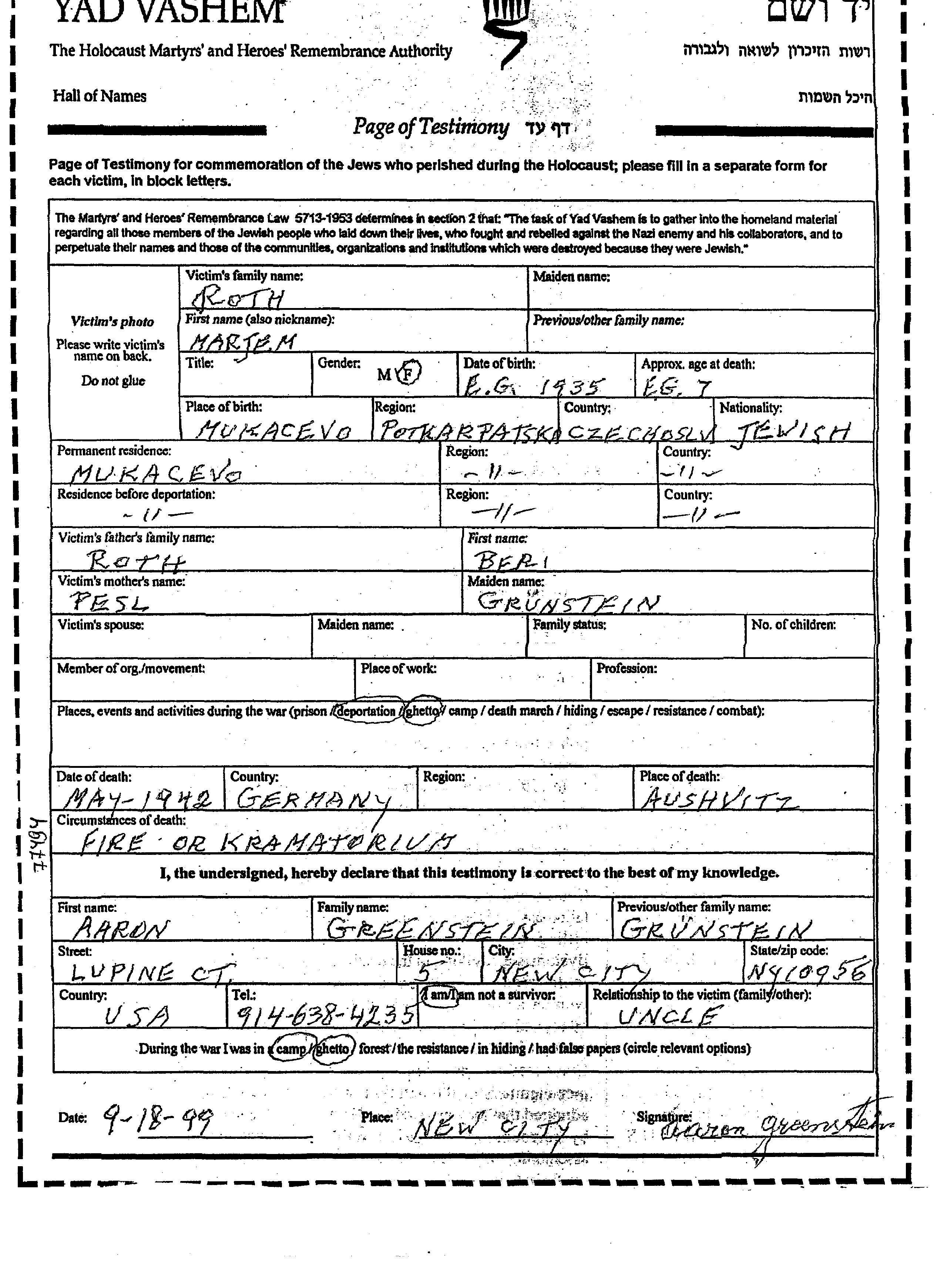 Marjem Roth wurde im Jahr 1935 in Mukacevo, Tschechoslowakei geboren. Sie war die Tochter von Bari und Pesl. Sie war Kind. Vor dem Zweiten Weltkrieg lebte sie in Mukacevo, Tschechoslowakei. Während des Krieges war sie in Mukacevo, Tschechoslowakei.
