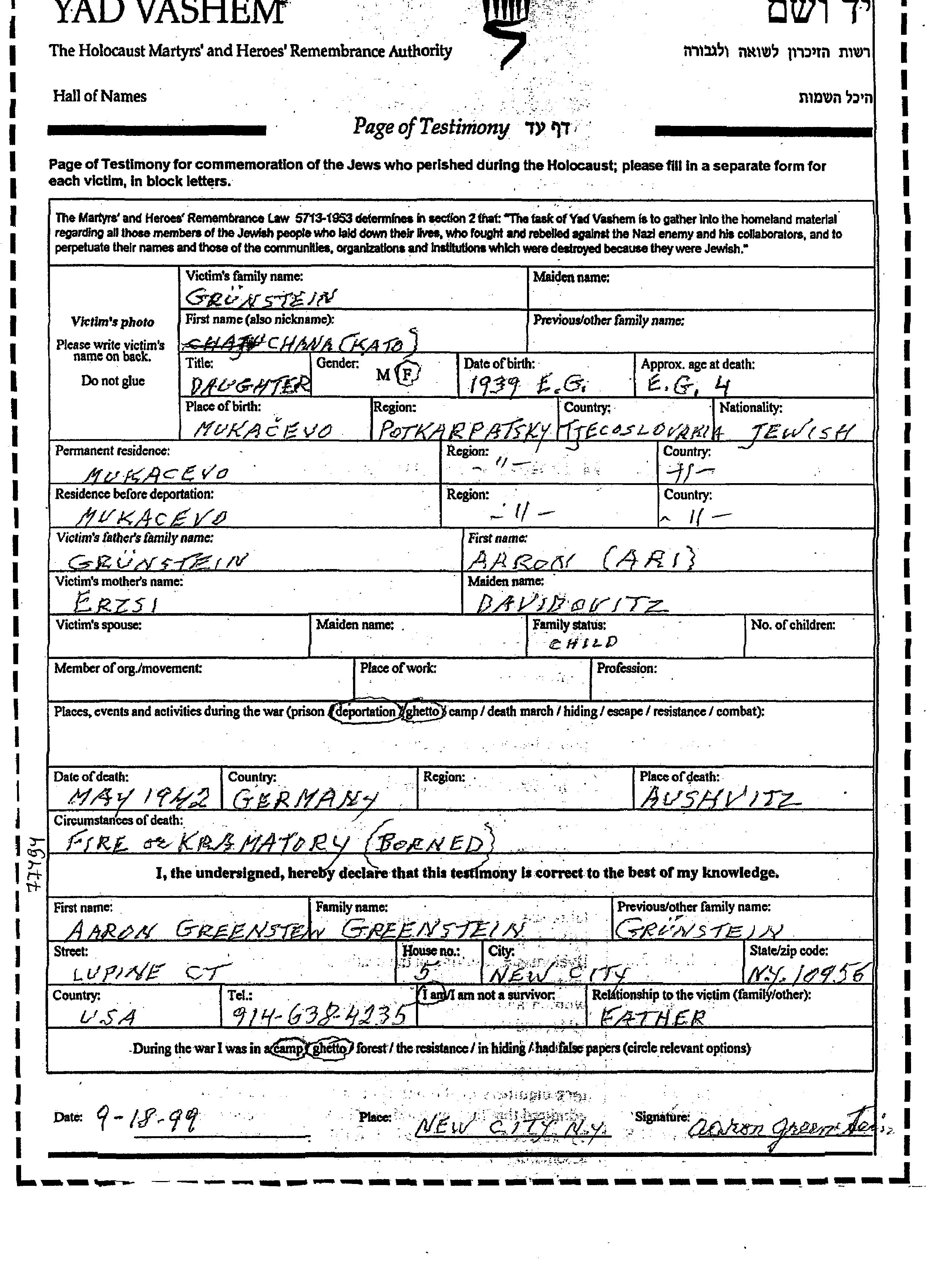 Grünstein Chana Kato 1939 Mukacevo, Tschechoslowakei Gedenkblatt