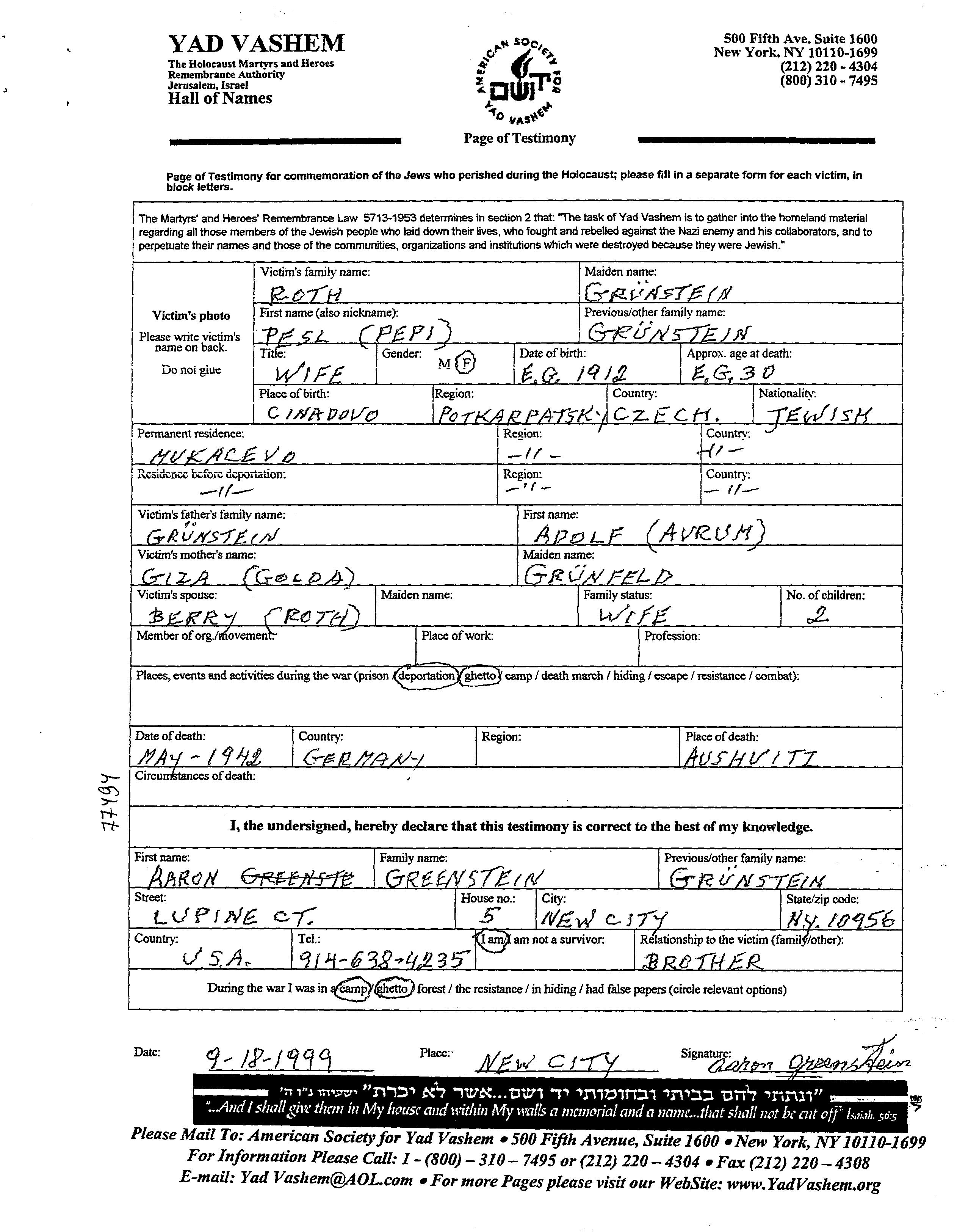 Pesl Pepi Roth, geb. Grünstein wurde im Jahr 1912 in Mukacevo, Tschechoslowakei geboren. Sie war die Tochter von Adolf Avrum und Giza Golda. Sie war mit Berry Verheiratet. Vor dem Zweiten Weltkrieg lebte sie in Mukacevo, Tschechoslowakei.