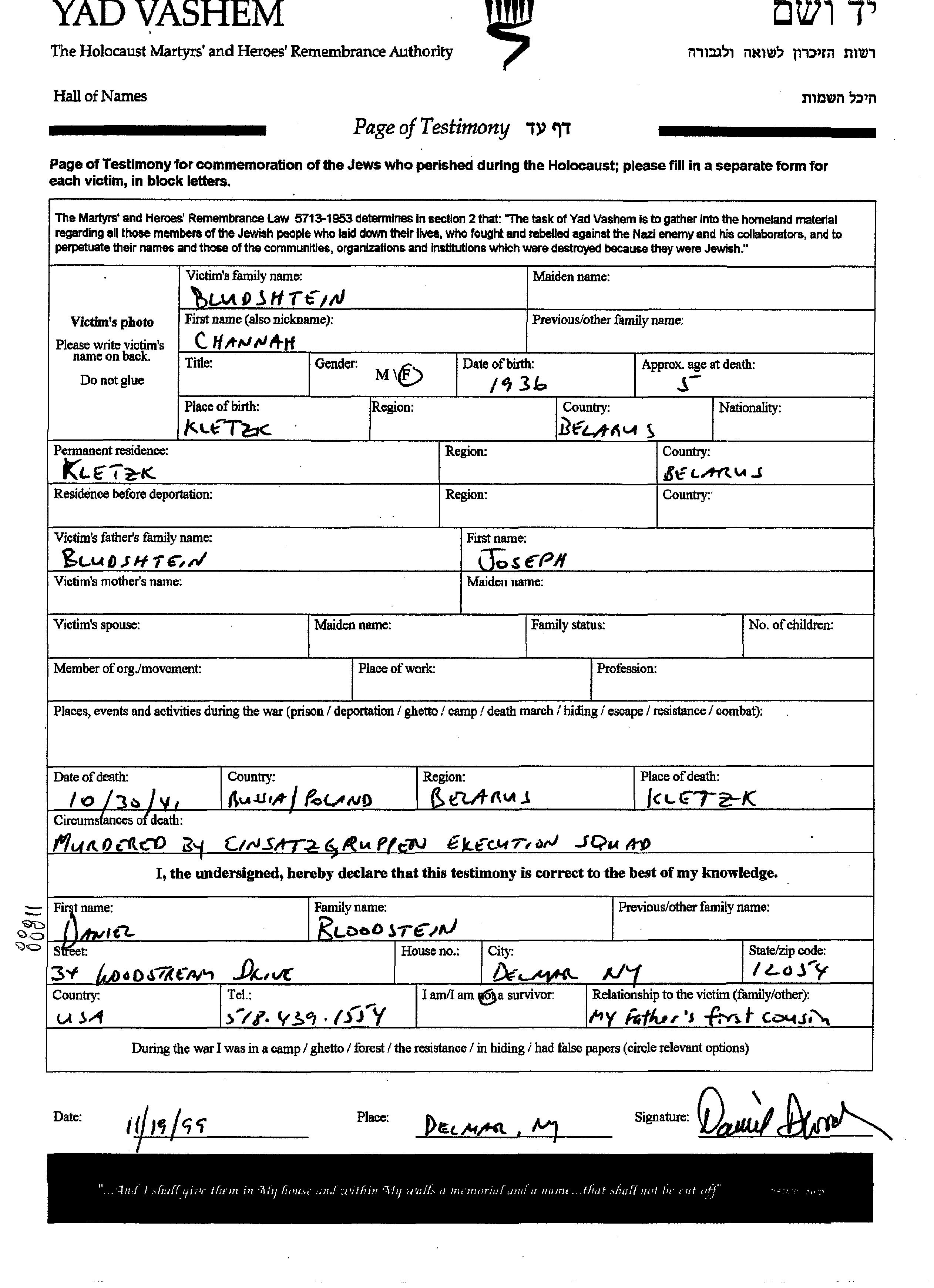 Channah Bludshtein wurde im Jahr 1936 in Kletsk, Polen geboren. Sie war die Tochter von Joseph. Sie war Kind. Vor dem Zweiten Weltkrieg lebte sie in Kletsk, Polen. Während des Krieges war sie in Kletsk, Polen.