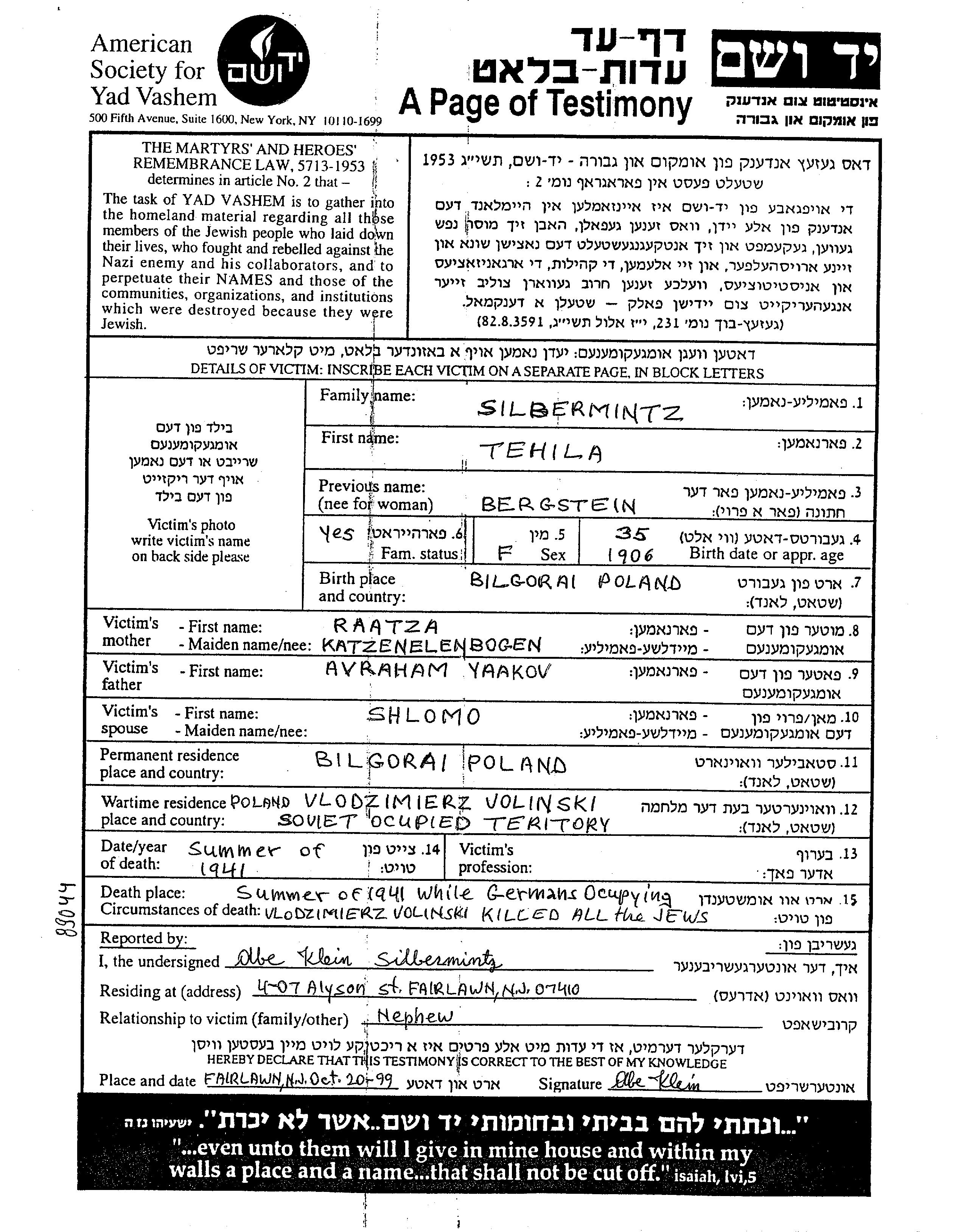 Tehila Silbermintz, geb. Bergstein wurde im Jahr 1906 in Bilgoraj, Polen geboren. Sie war die Tochter von Avraham Yaakov und Raatza. Vor dem Zweiten Weltkrieg lebte sie in Bilgoraj, Polen. Während des Krieges war sie in Wlodzimierz Wolynski, Polen.