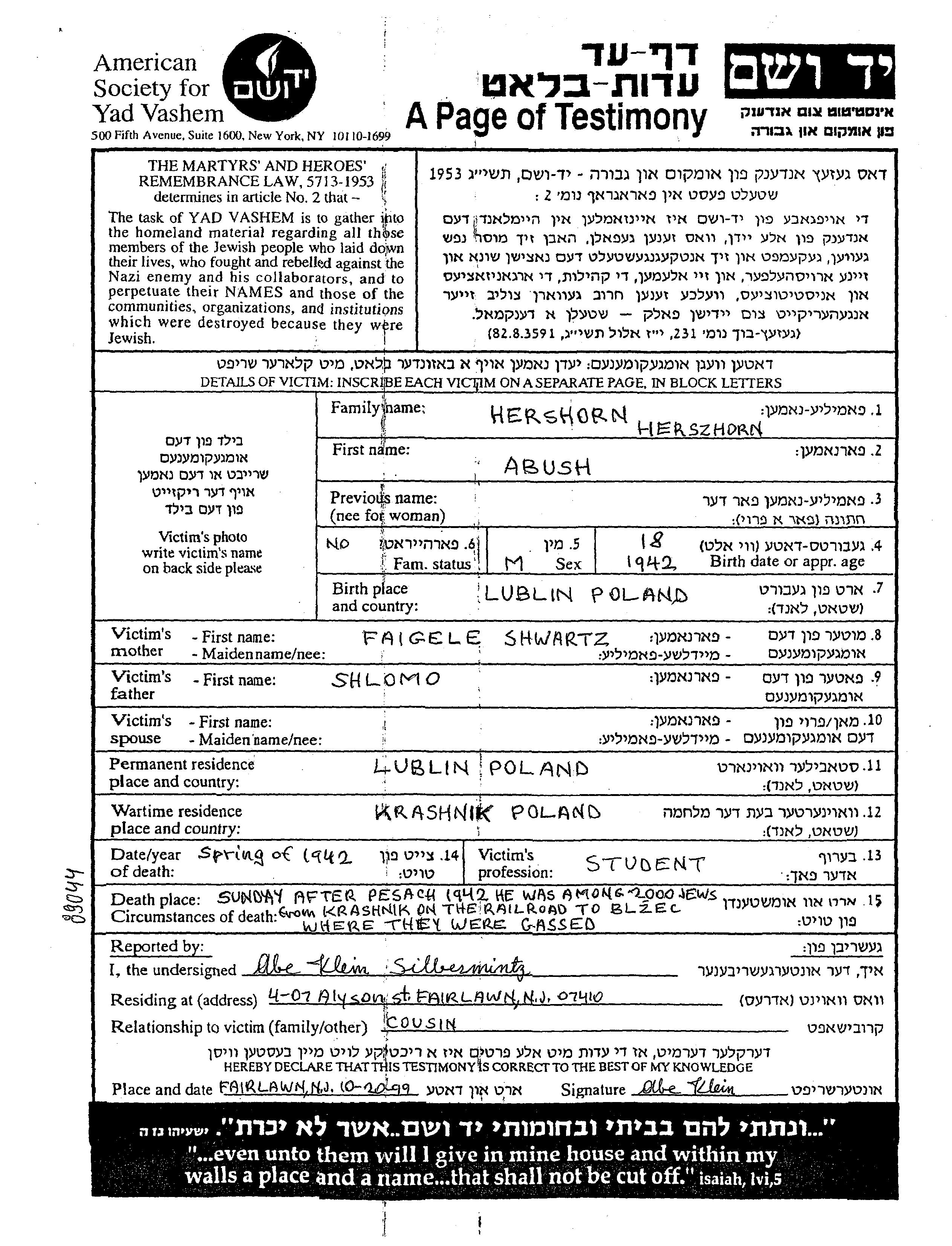 Aba Hershorn wurde in Lublin, Polen geboren. Er war der Sohn von Shlomo und Faigele. Er war Student und Ledig. Vor dem Zweiten Weltkrieg lebte er in Lublin, Polen. Während des Krieges war er in Krašnik, Polen.