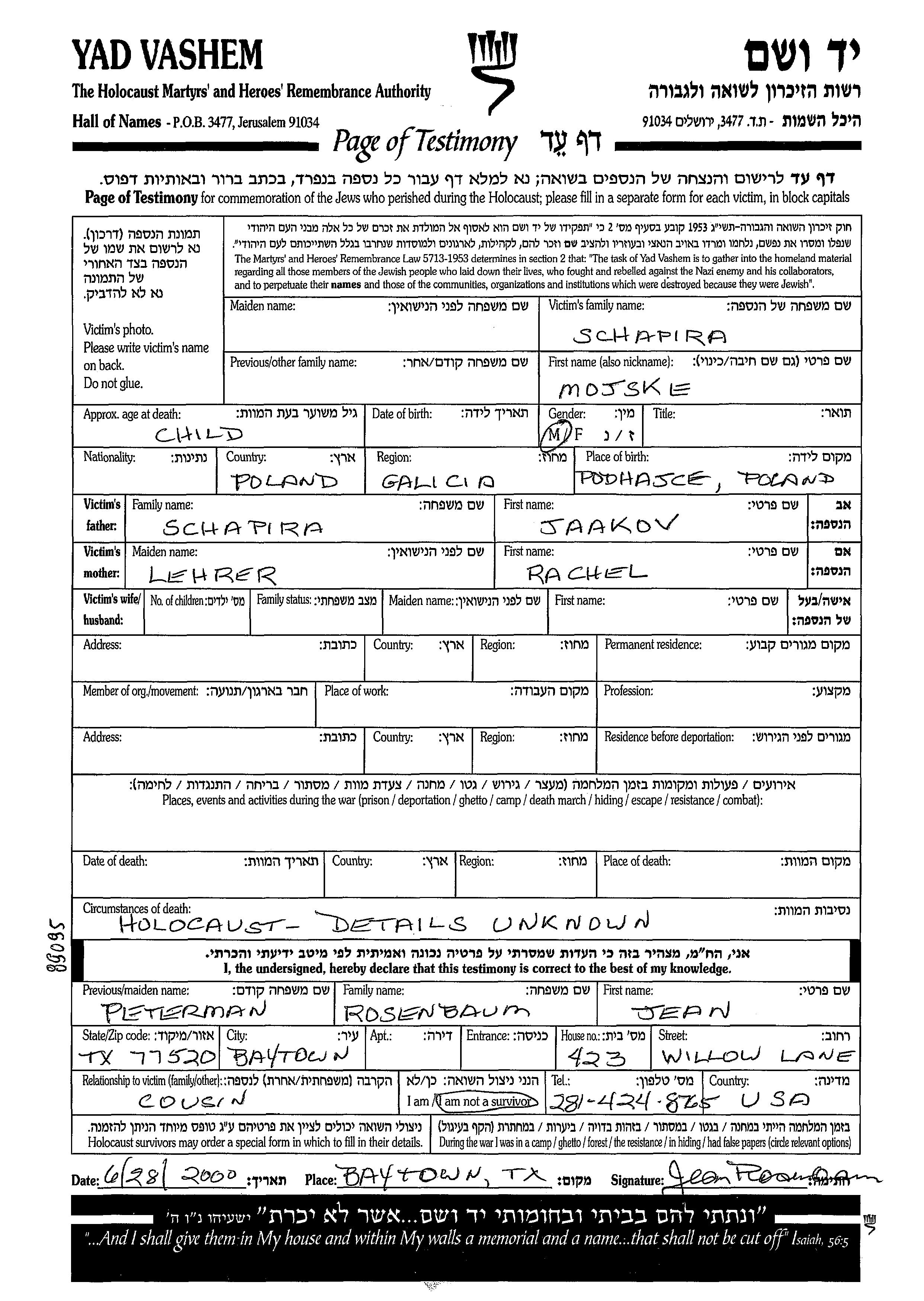 Schapira Mojske unbekannter Ort, Gedenkblatt