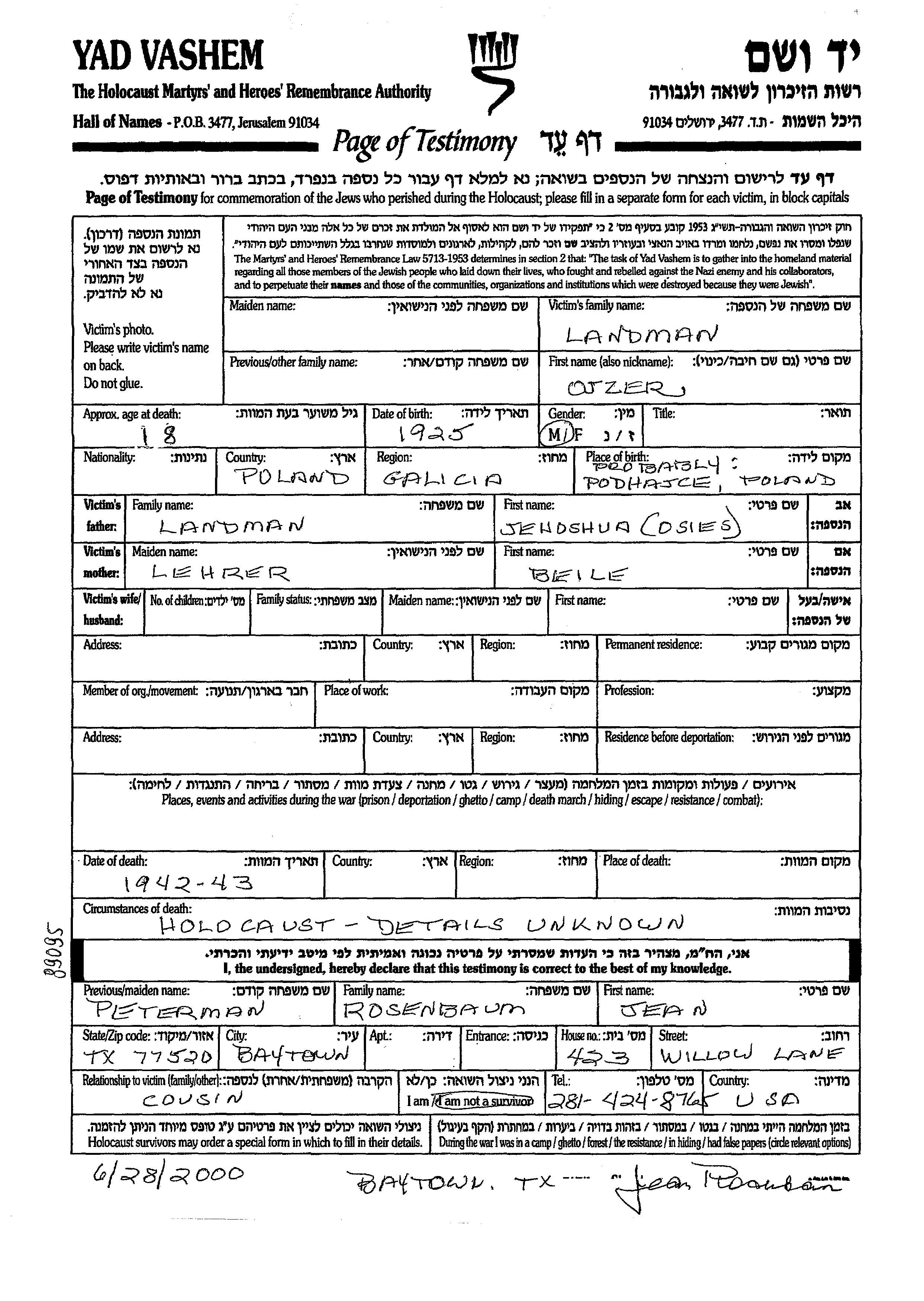 Ojzer Landman wurde im Jahr 1925 in Podhajce, Polen geboren. Er war der Sohn von Jehoshua und Beile.