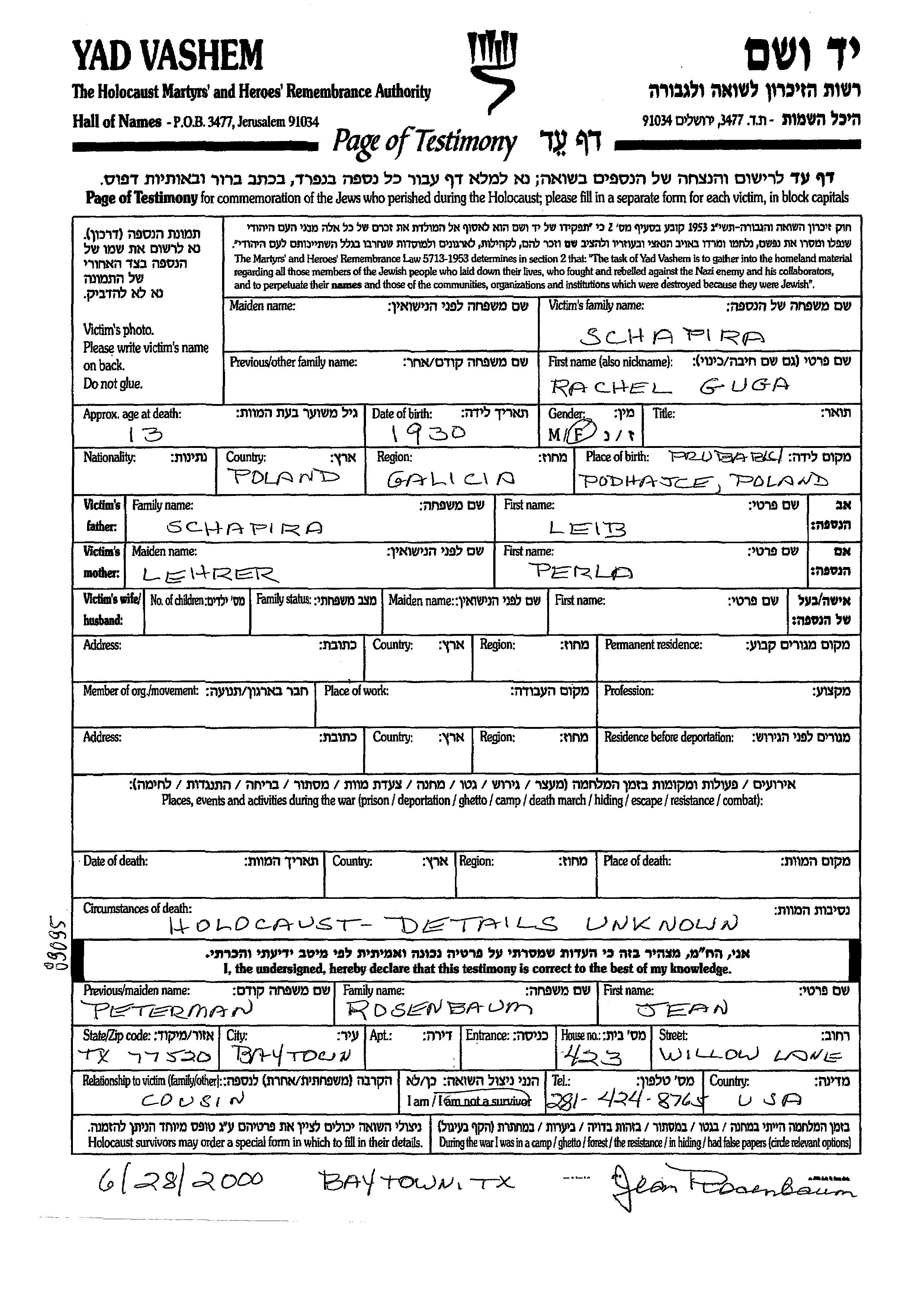 Rachel Guga Schapira wurde im Jahr 1930 in Podhajce, Polen geboren. Sie war die Tochter von Leib und Perla.