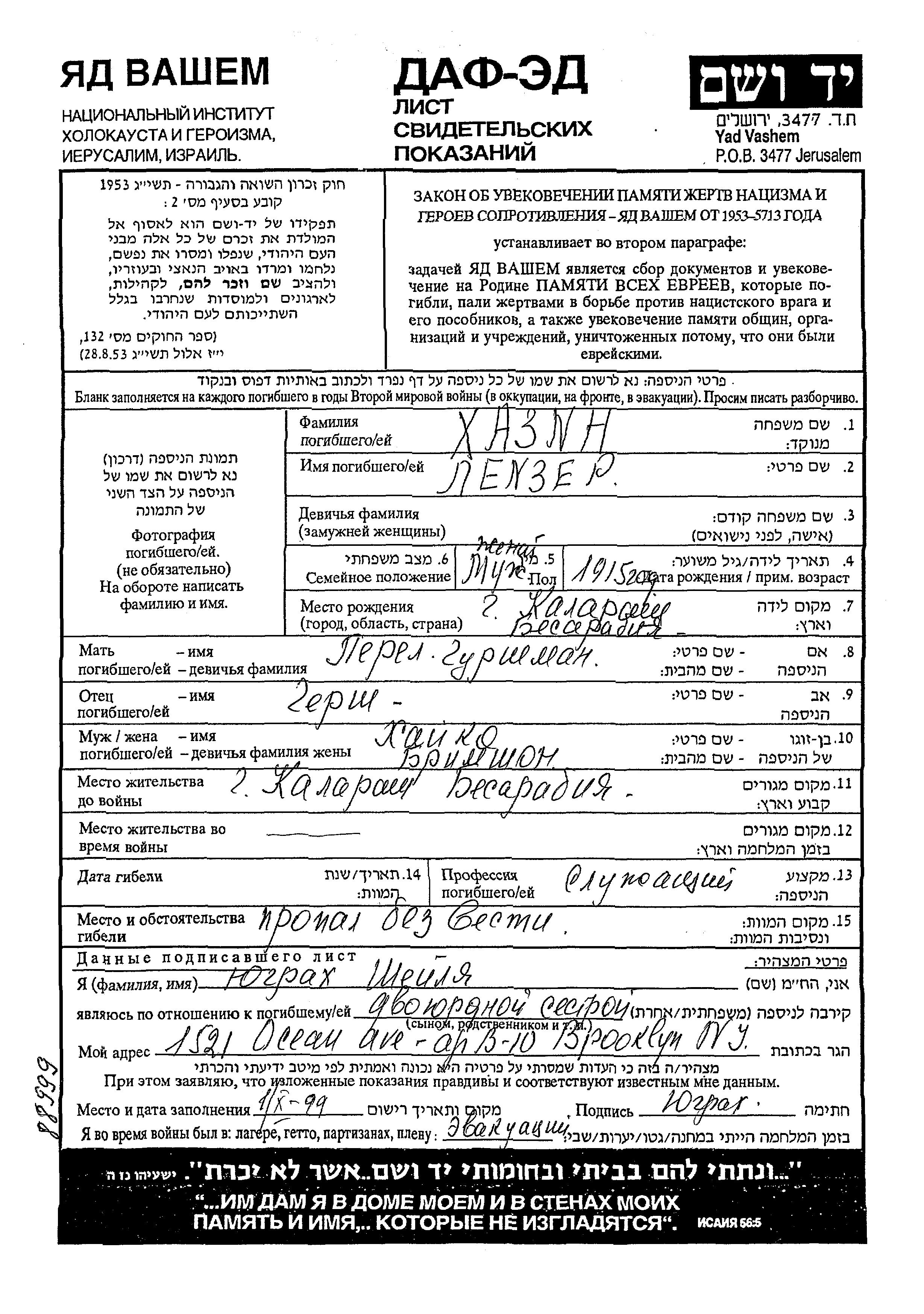 Leizer Khazin wurde im Jahr 1915 in Kalaras, Rumänien geboren. Er war der Sohn von Gersh und Perel. Er war Angestellte/-r und mit Khaika Verheiratet. Vor dem Zweiten Weltkrieg lebte er in Kalaras, Rumänien.