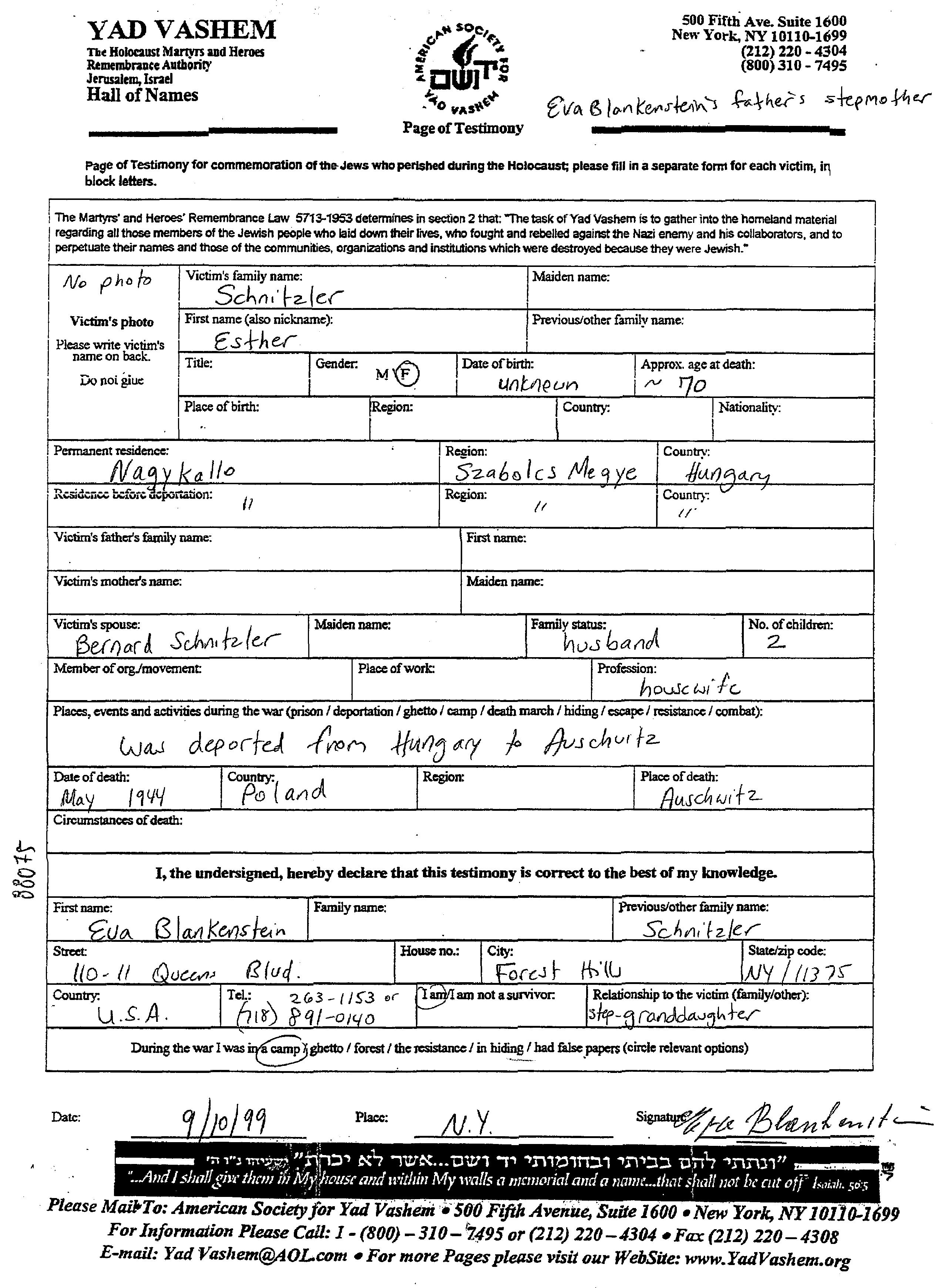 Esther Schnitzler. Sie war Hausfrau und mit Bernard Verheiratet. Vor dem Zweiten Weltkrieg lebte sie in Nagykajan, Rumänien. Während des Krieges war sie in Nagykajan, Rumänien.