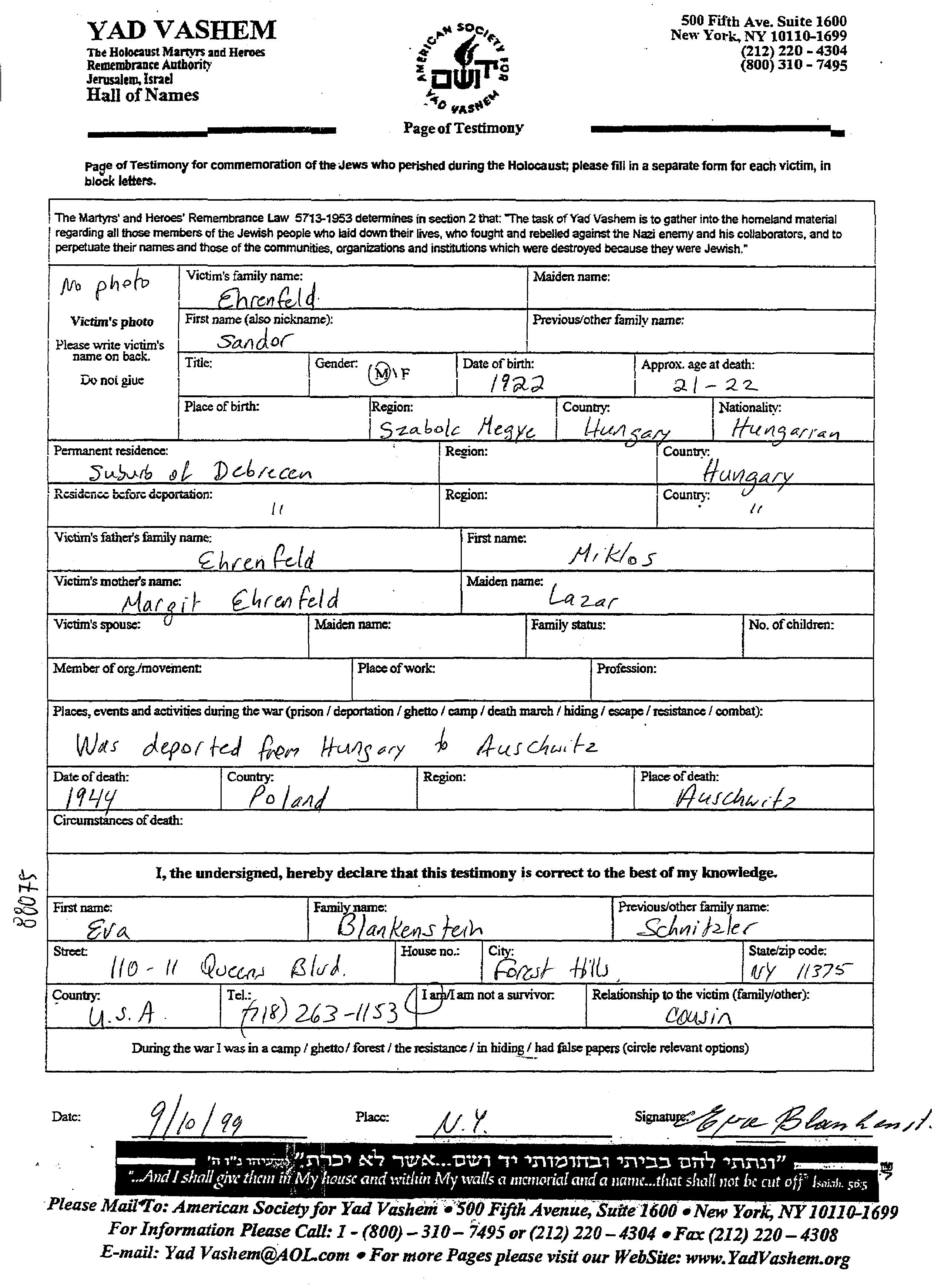 Sandor Ehrenfeld wurde im Jahr 1922 in Szabolcs, Ungarn geboren. Er war der Sohn von Miklos und Margit. Er war Ledig. Vor dem Zweiten Weltkrieg lebte er in Debrecen, Ungarn. Während des Krieges war er in Debrecen, Ungarn.