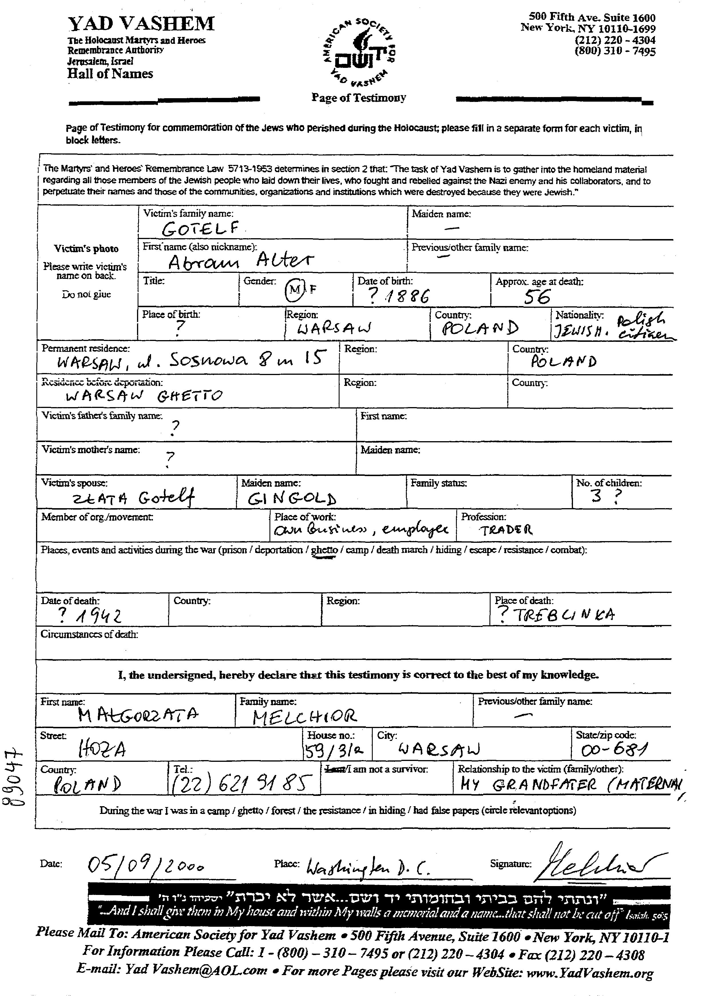 Abram Alter Gotelf wurde im Jahr 1886 in Warsaw, Polen geboren. Er war Kaufmann/-frau und mit Zlata, geb. Gingold Verheiratet. Vor dem Zweiten Weltkrieg lebte er in Warsaw, Polen. Während des Krieges war er in Warsaw, Polen.