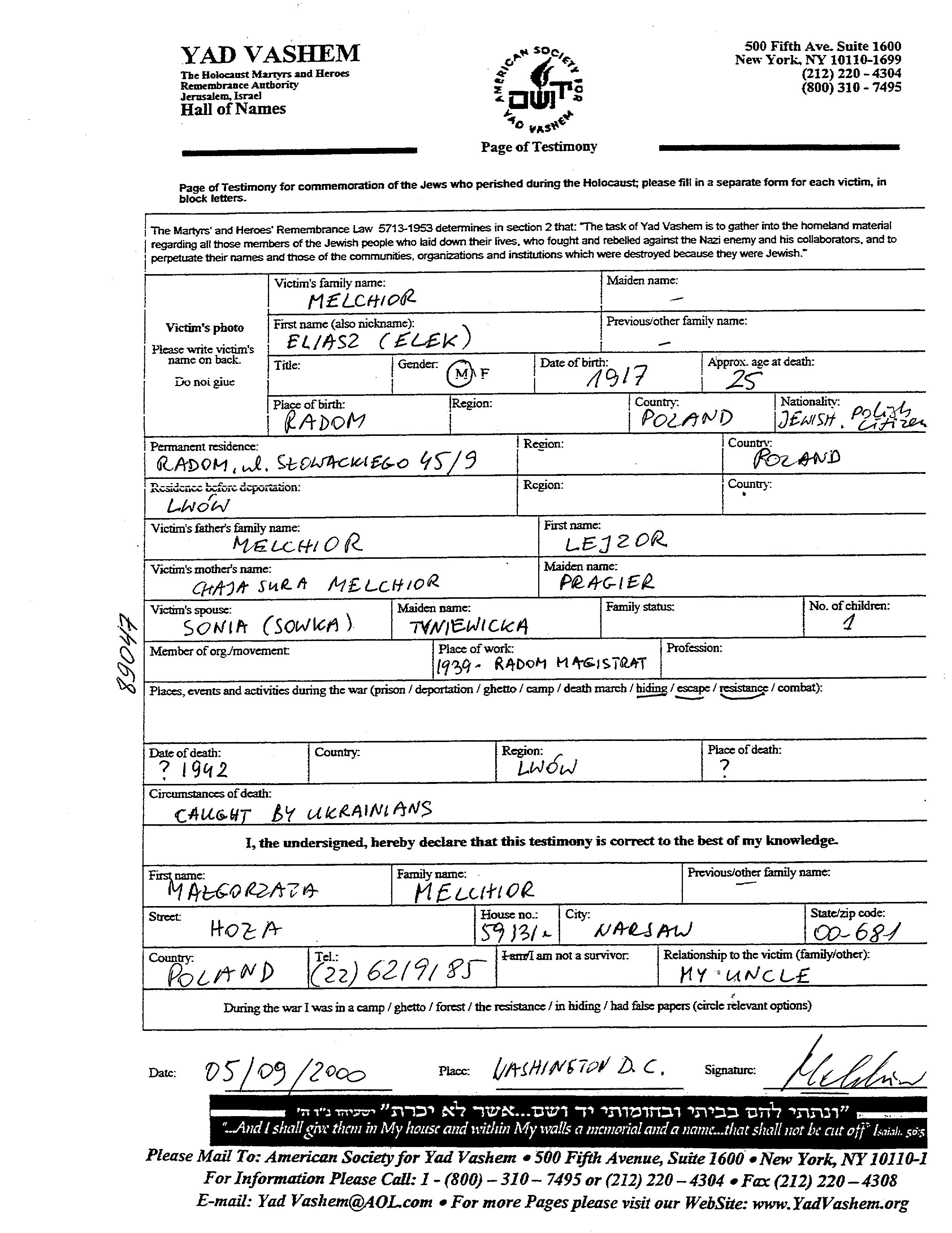Eliasz Alek Melchior wurde im Jahr 1917 in Radom, Polen geboren. Er war der Sohn von Lejzor und Chaja Sura. Er war mit Sonia Sowka, geb. Tyniewicki Verheiratet. Vor dem Zweiten Weltkrieg lebte er in Radom, Polen. Während des Krieges war er in Lwow, Polen.