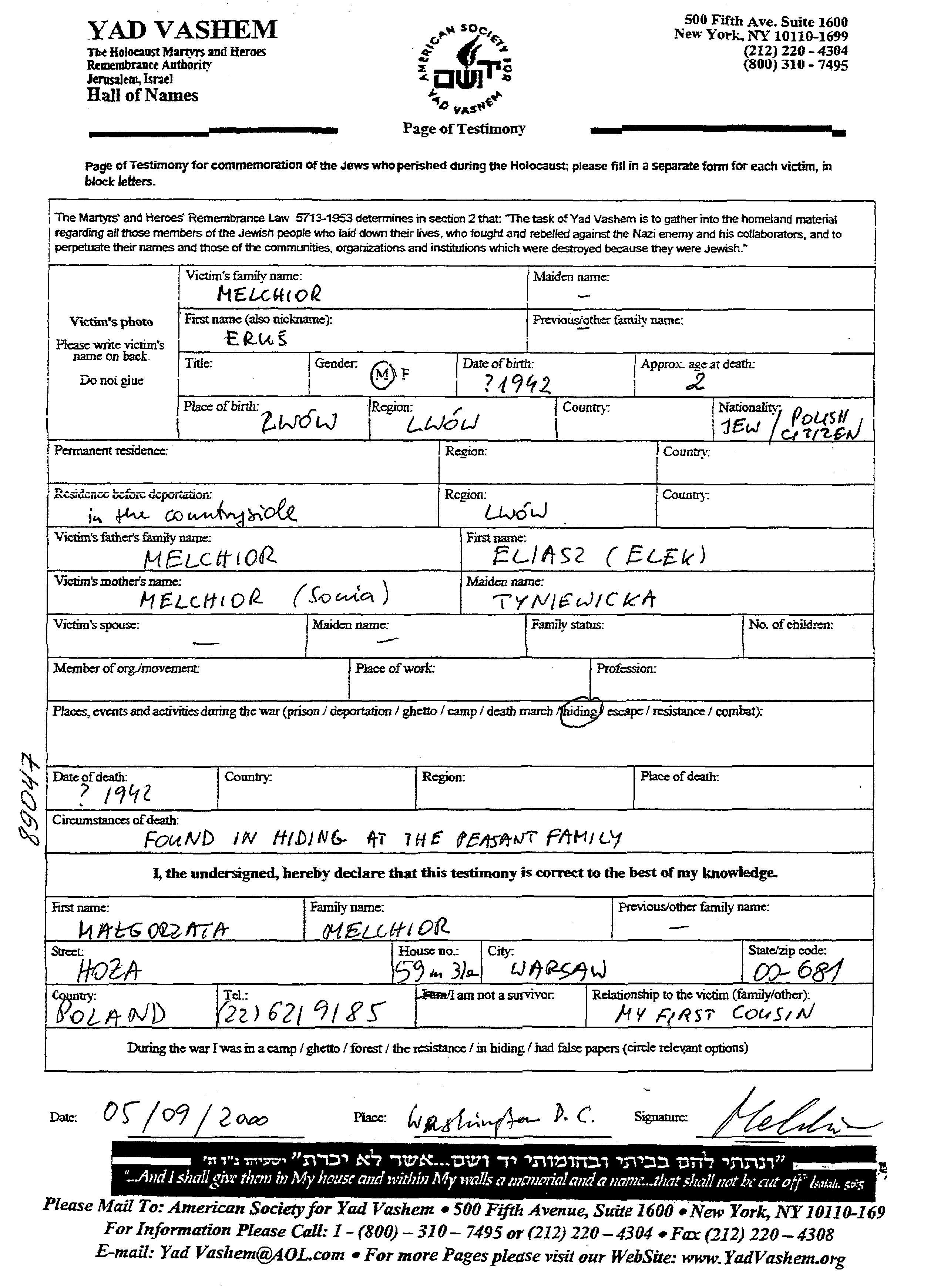 Erus Melchior wurde im Jahr 1942 in Lwow, Polen geboren. Er war der Sohn von Eliasz Alek und Sonia. Er war Kind. Während des Krieges war er in Lwow, Polen.