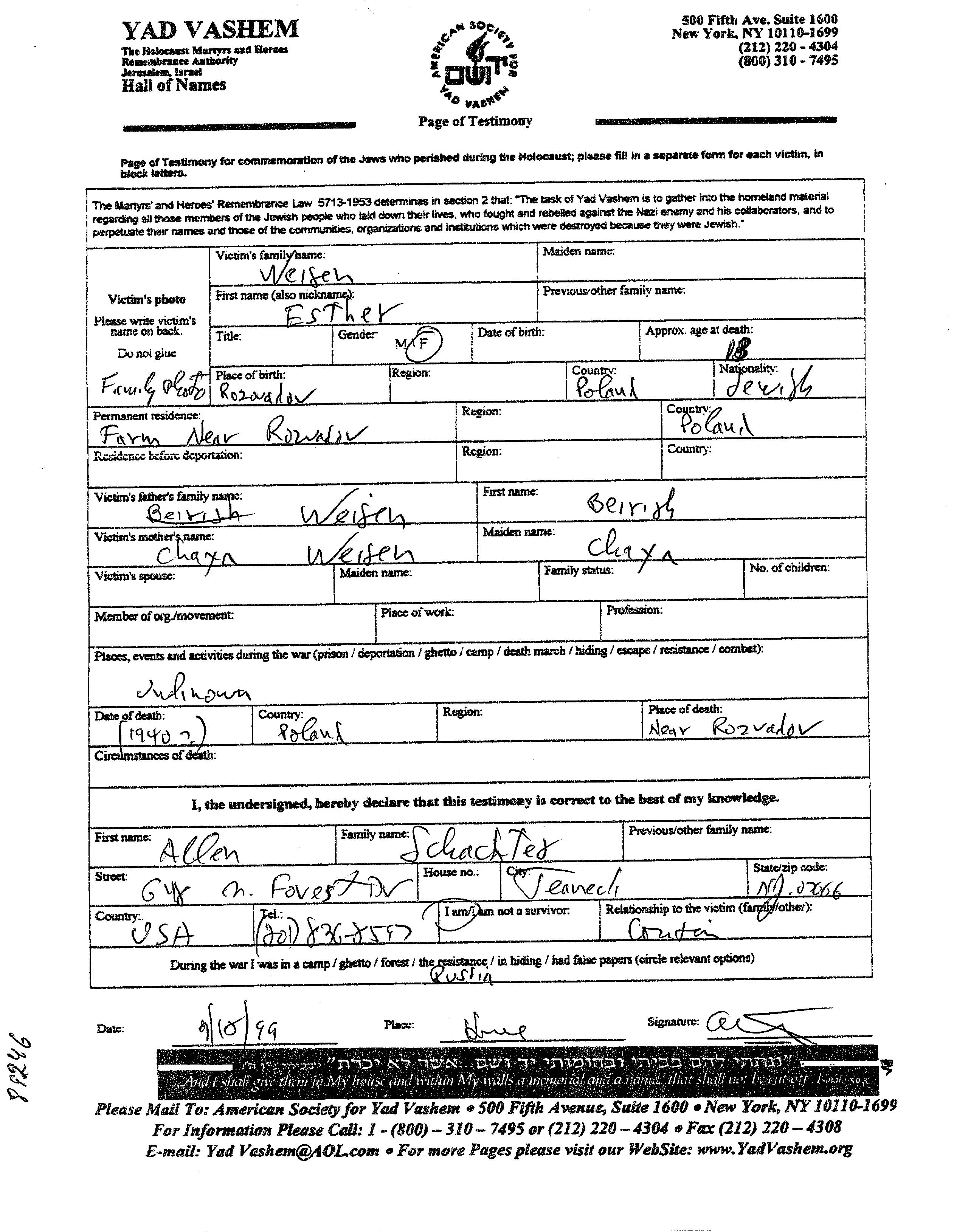 Weisen Esther Rozwadów, Polen Gedenkblatt