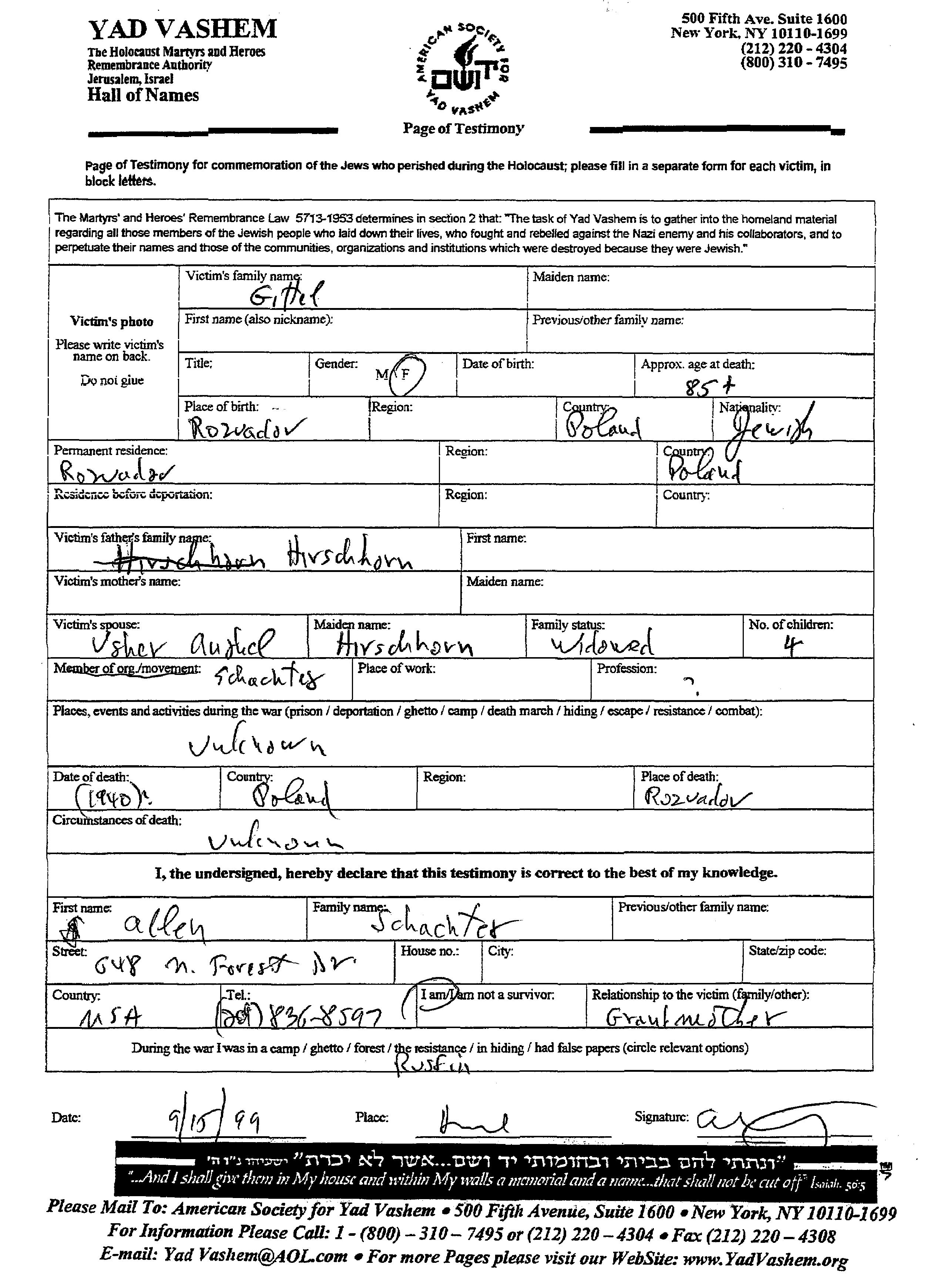 Vorname unbekannt Gittel wurde in Rozwadów, Polen geboren. Er war mit Usher Aushel, geb. Hirschhorn Witwe. Vor dem Zweiten Weltkrieg lebte er in Rozwadów, Polen.