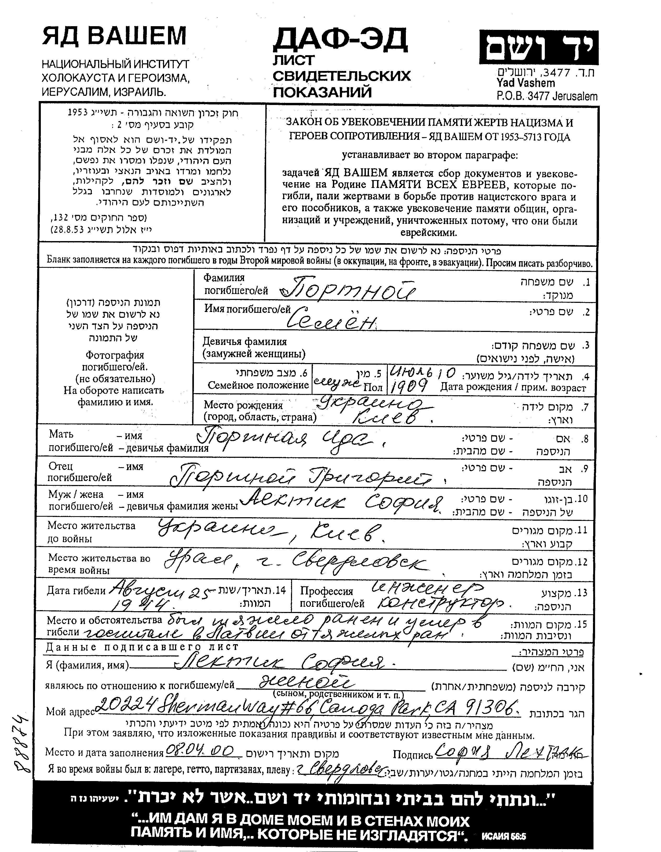 Semyon Portnoi wurde im Jahr 1909 in Kiyev, Ukraine (UdSSR) geboren. Er war der Sohn von Grigori und Ida. Er war Ingenieur. Vor dem Zweiten Weltkrieg lebte er in Kiyev, Ukraine (UdSSR). Während des Krieges war er in die Sowjetischen Streitkräfte. Semyon im Militärdienst umgekommen. Todesort: Lettland im Jahr 1944.