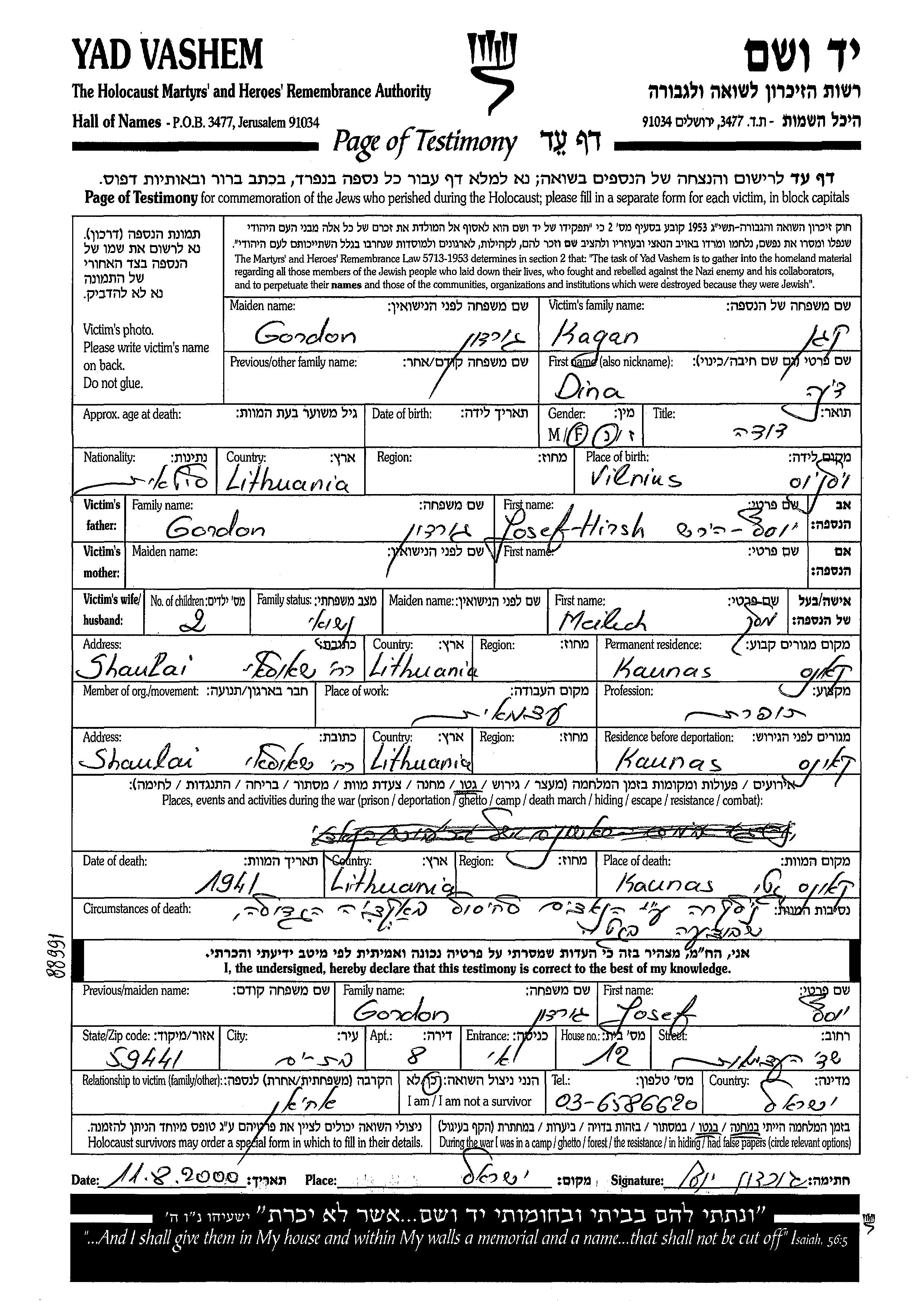 Dina Kagan, geb. Gordon wurde in Vilnius, Polen geboren. Sie war die Tochter von Josef Hirsh. Sie war Schneiderin und mit Meilech Verheiratet. Vor dem Zweiten Weltkrieg lebte sie in Kaunas, Litauen. Während des Krieges war sie in Kaunas, Litauen.