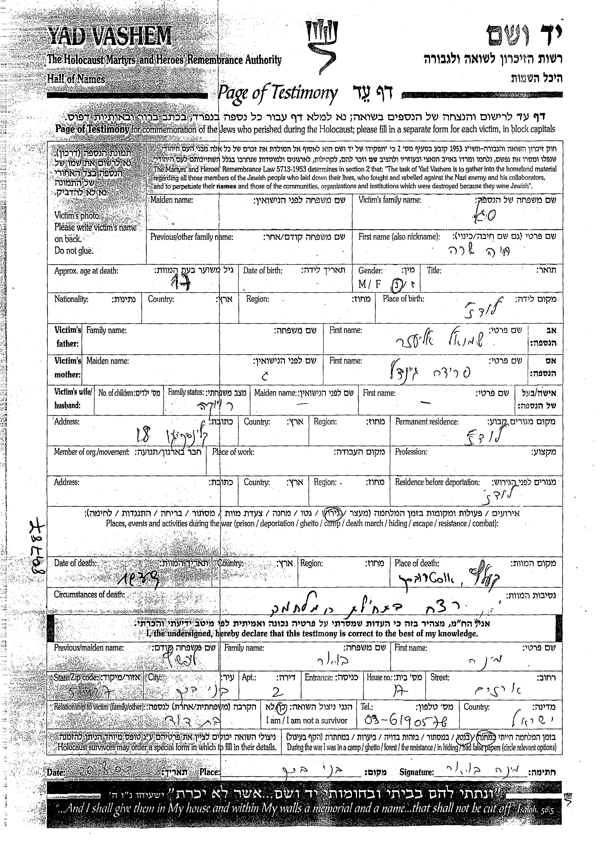 Segal Khaia Sara Lodz, Polen Gedenkblatt