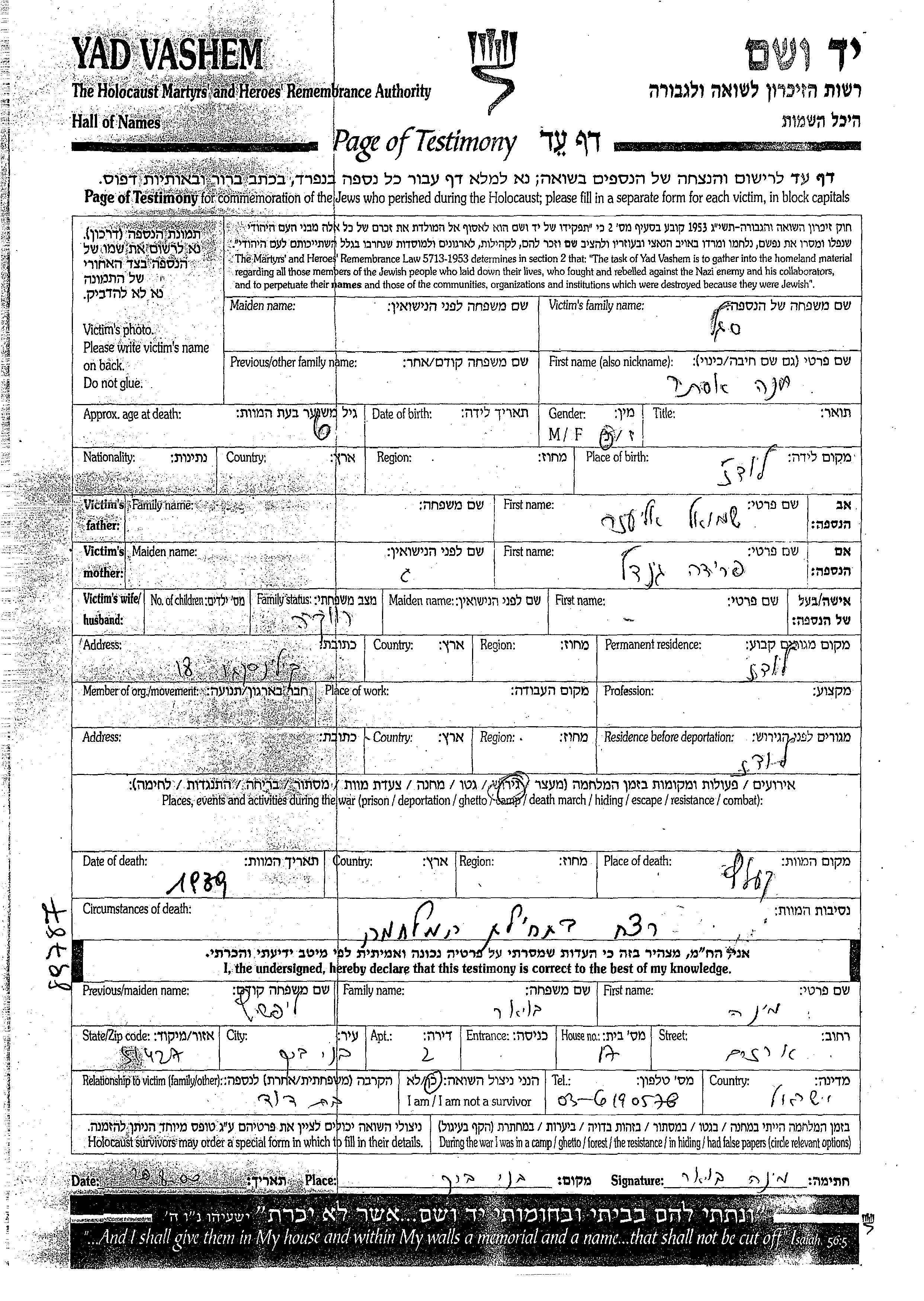 Segal Khana Ester Lodz, Polen Gedenkblatt