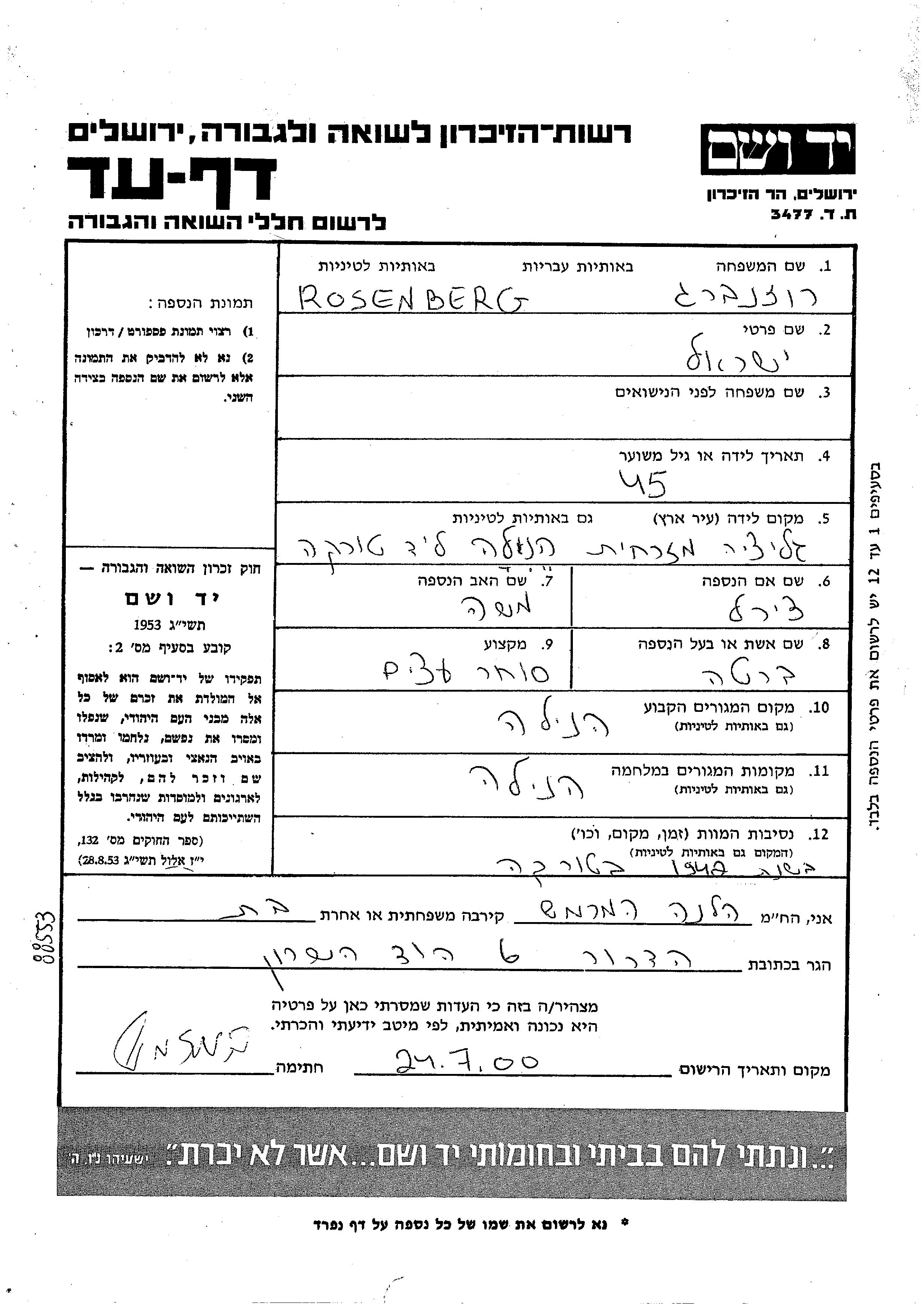 Yisrael Rosenberg wurde in Hnyla, Polen geboren. Er war der Sohn von Moshe und Tzirel. Er war Holzhändler/-in und mit Berta Verheiratet. Vor dem Zweiten Weltkrieg lebte er in Hnyla, Polen. Während des Krieges war er in Hnyla, Polen.