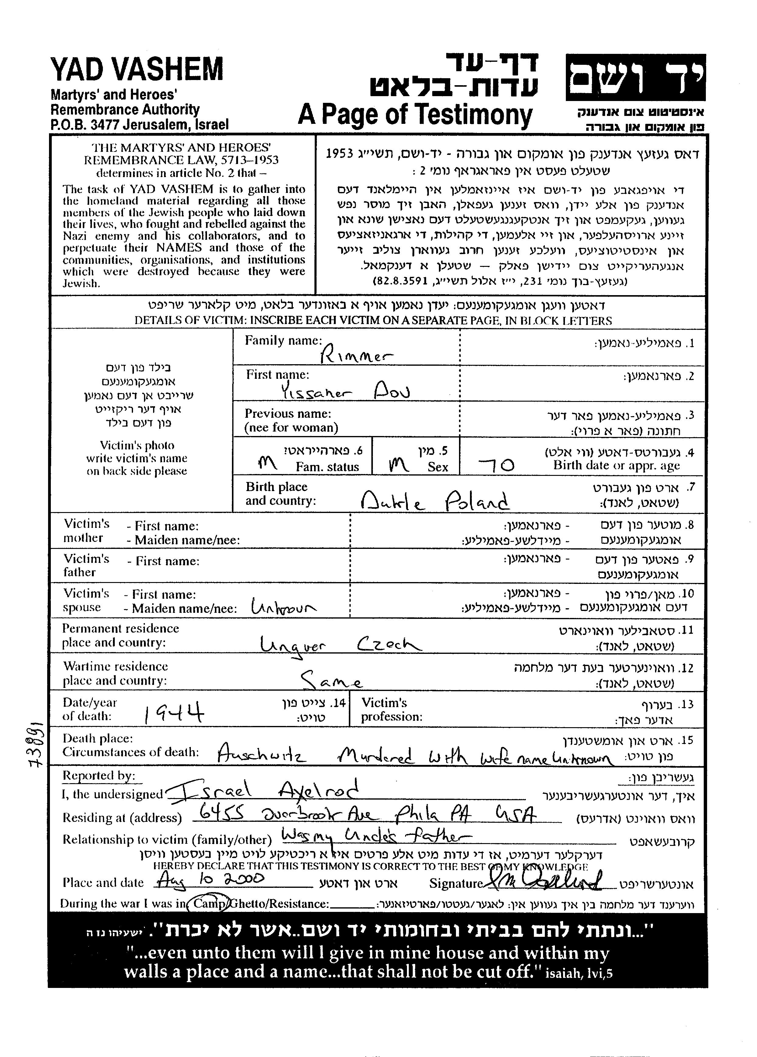 Yissaher Dov Rinner wurde in Dukla, Polen geboren. Er war Verheiratet. Vor dem Zweiten Weltkrieg lebte er in Ungvar, Tschechoslowakei. Während des Krieges war er in Ungvar, Tschechoslowakei.