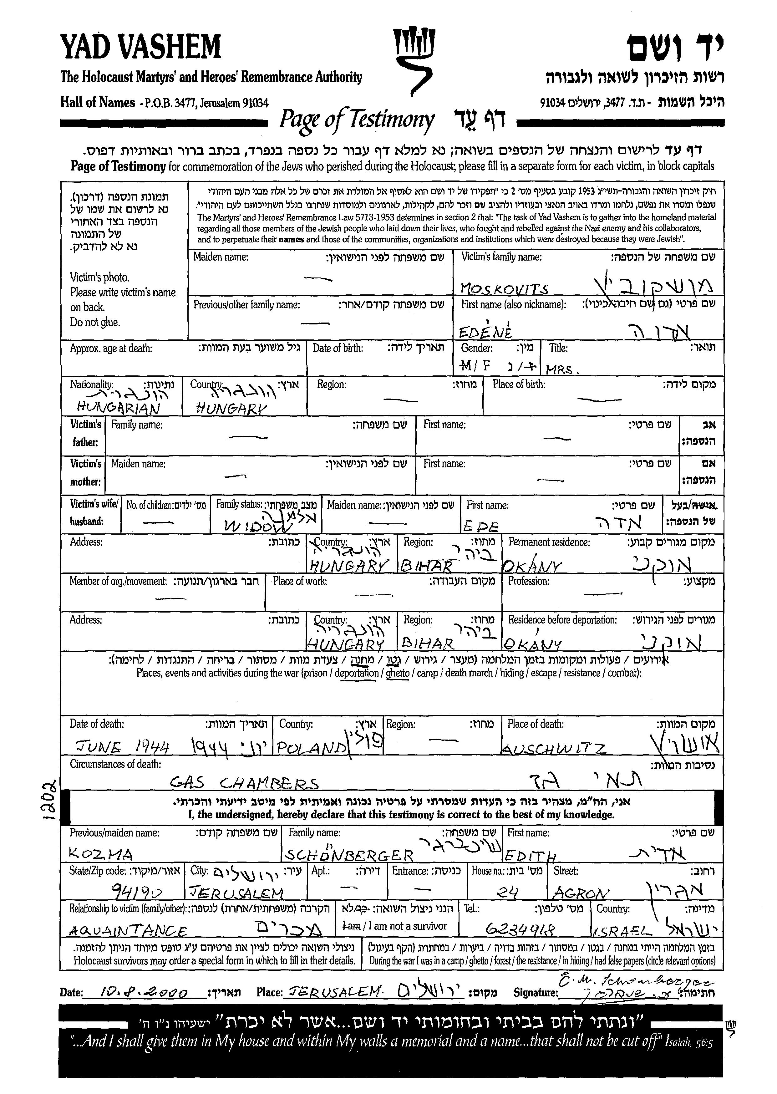 Vorname unbekannt Moskovits wurde in Ungarn geboren. Sie war mit Ede Witwe. Vor dem Zweiten Weltkrieg lebte sie in Okany, Ungarn. Während des Krieges war sie in Okany, Ungarn.