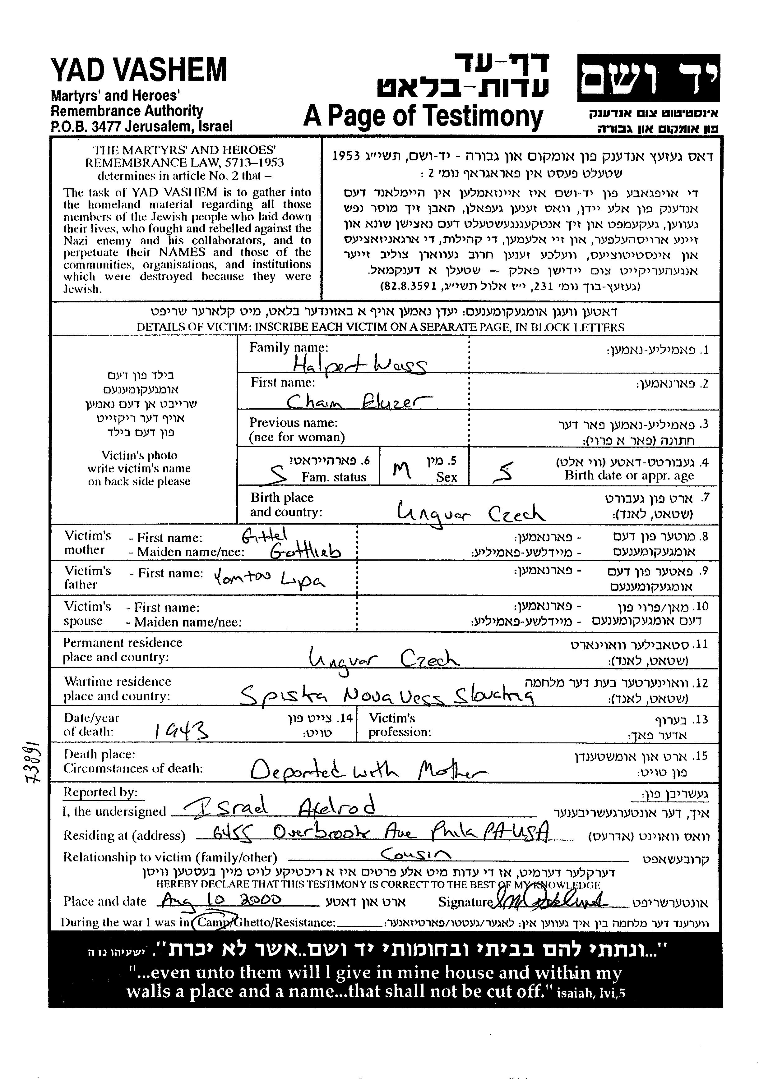 Halpert Waiss Chaim Eliezer Ungvar, Tschechoslowakei Gedenkblatt