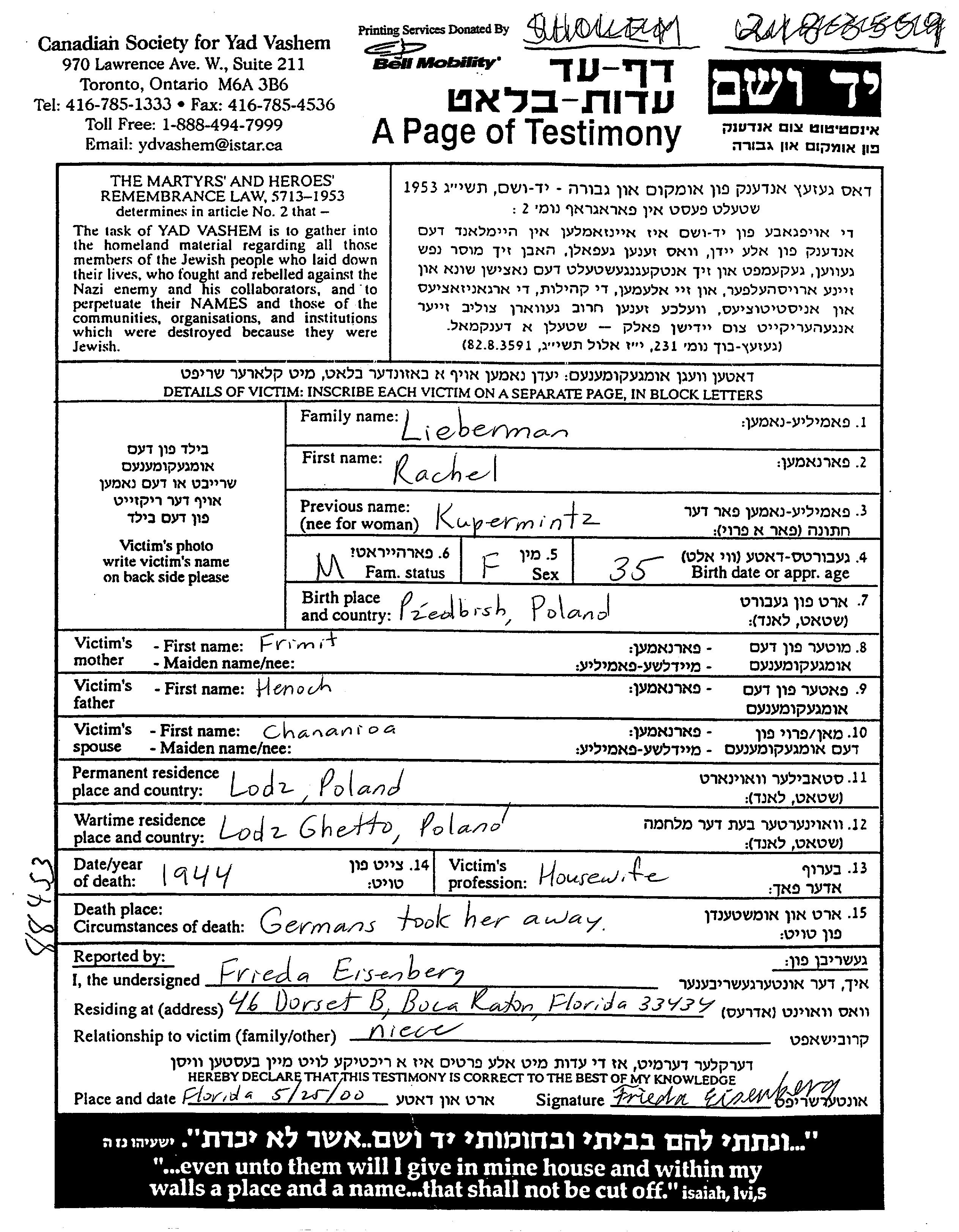 Rachel Lieberman, geb. Kupermintz wurde in Przedborz, Polen geboren. Sie war die Tochter von Henoch und Frimit. Sie war Hausfrau und mit Chananioa Verheiratet. Vor dem Zweiten Weltkrieg lebte sie in Lodzh, Polen. Während des Krieges war sie in Lodz, Polen.