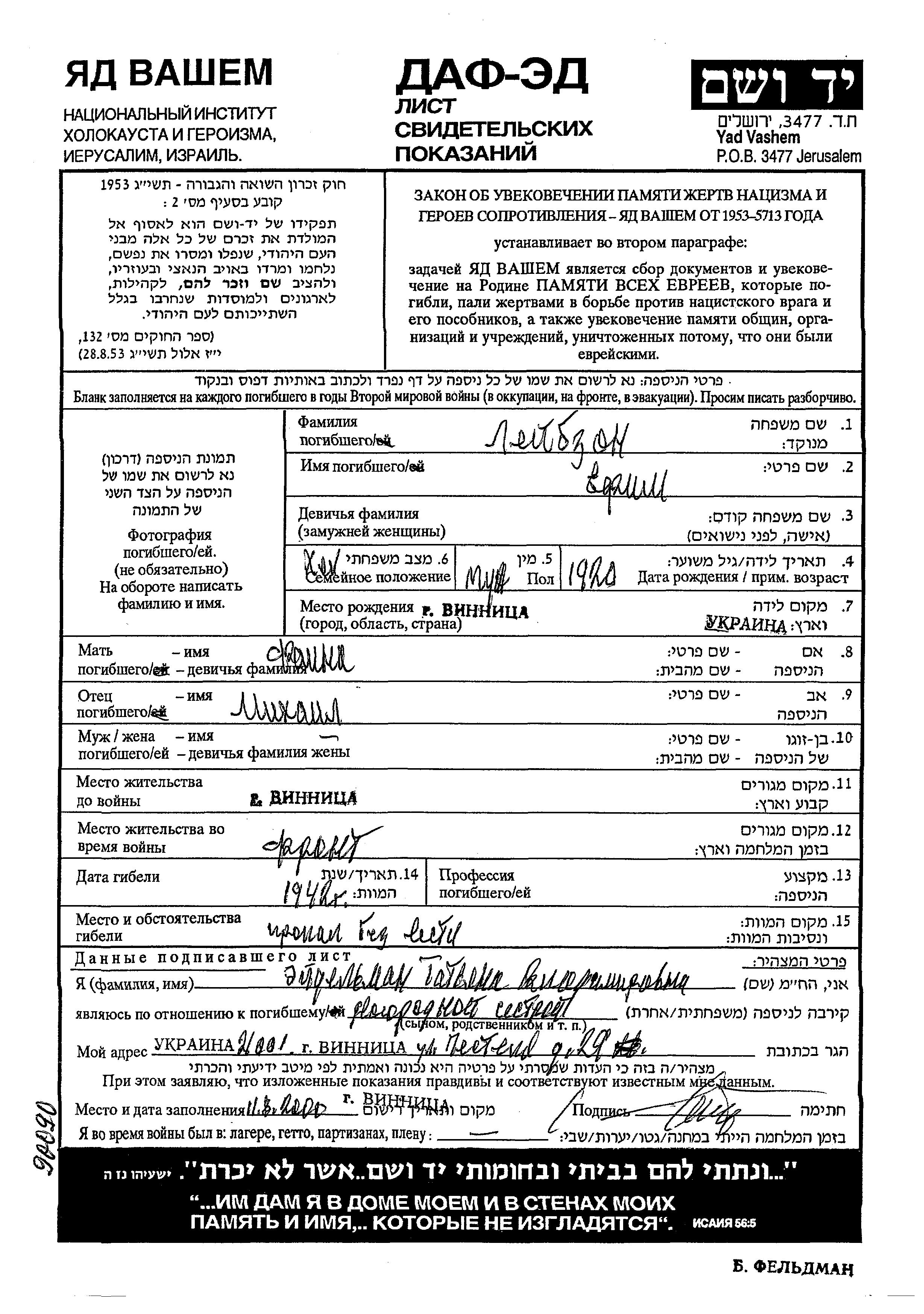 Leibzon Yefim 1920 Vinnitsa, Ukraine (UdSSR) Gedenkblatt