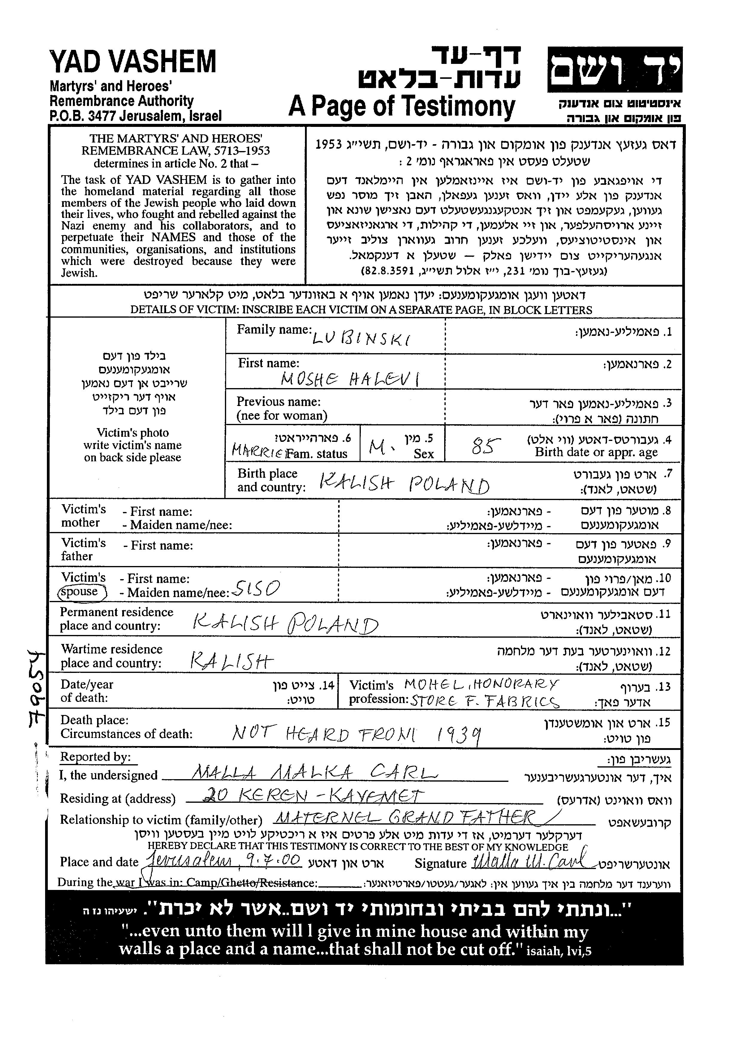 Moshe Halevi Lubinski wurde in Kalisz, Polen geboren. Er war Fabric store owner und mit Siso Verheiratet. Vor dem Zweiten Weltkrieg lebte er in Kalisz, Polen. Während des Krieges war er in Kalisz, Polen.
