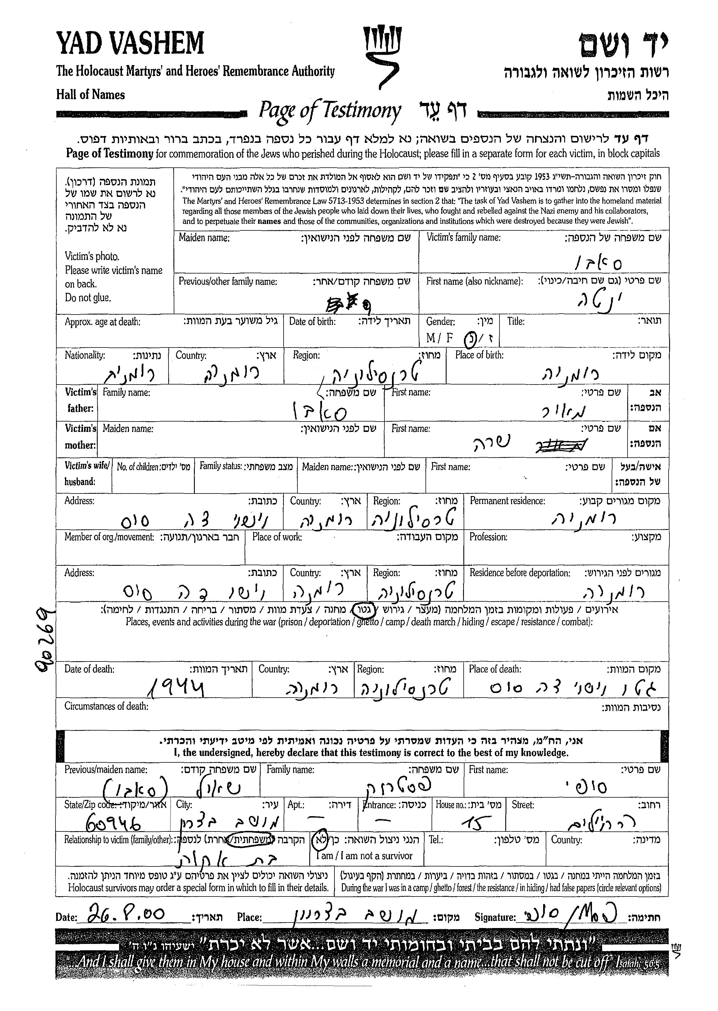 Yenta wurde in der Schoah ermordet. Todesort: Viseul de Sus, Rumänien im Jahr 1944.