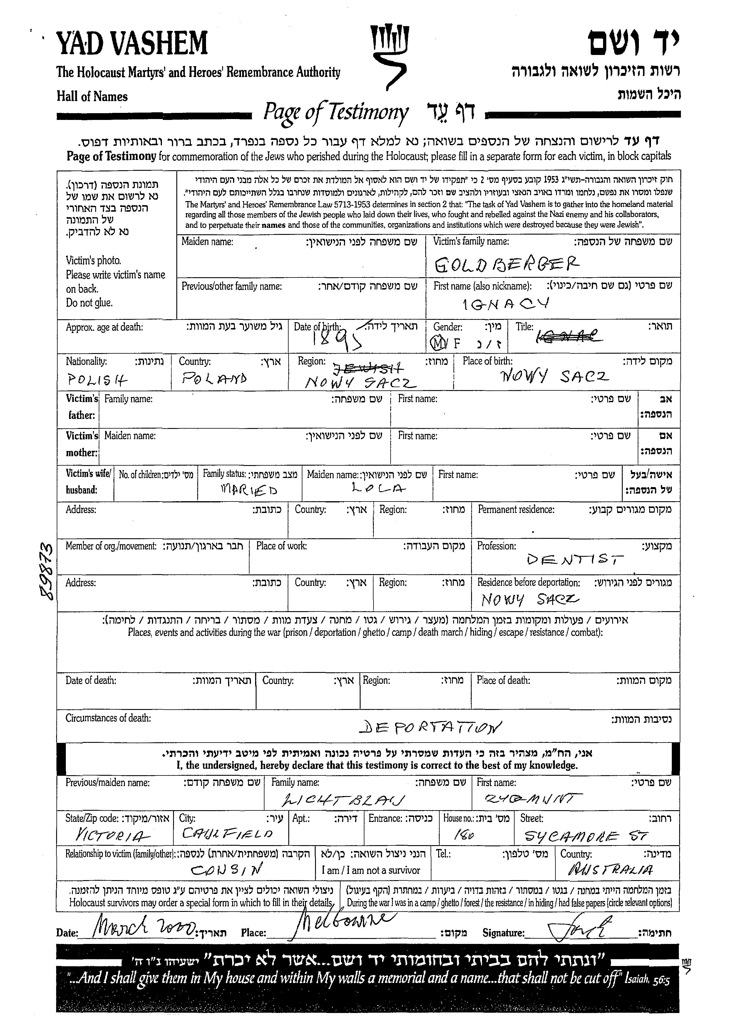 Ignacy Goldberger wurde im Jahr 1895 in Nowy Sacz, Polen geboren. Er war Zahnarzt/-ärztin und mit Lola Verheiratet. Während des Krieges war er in Nowy Sacz, Polen.