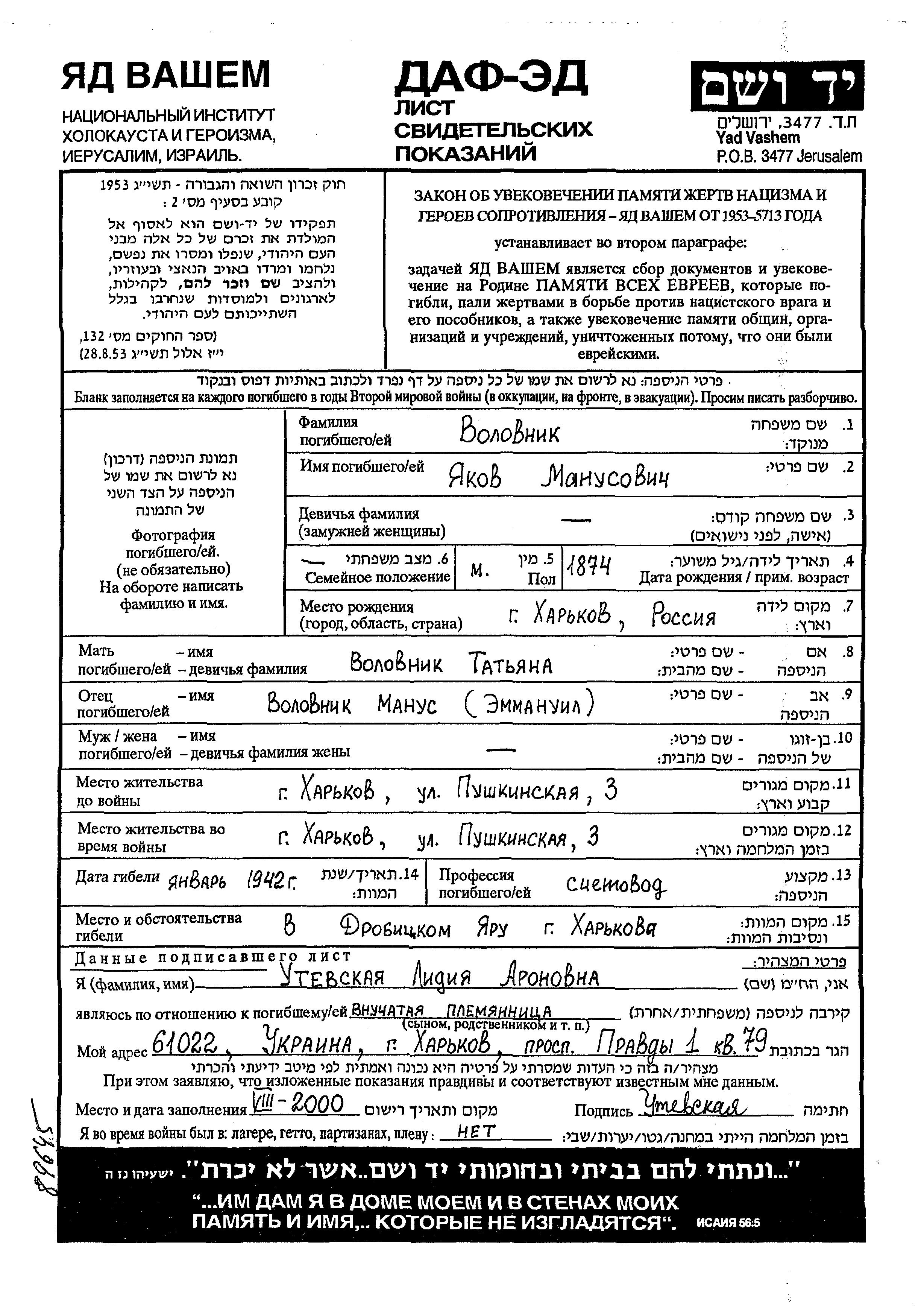 Yakov Volovnik wurde im Jahr 1874 in Kharkov, Ukraine (UdSSR) geboren. Er war der Sohn von Menakhem Emmanuil und Tatiana. Er war Buchhalter/-in. Vor dem Zweiten Weltkrieg lebte er in Kharkov, Ukraine (UdSSR). Während des Krieges war er in Kharkov, Ukraine (UdSSR).