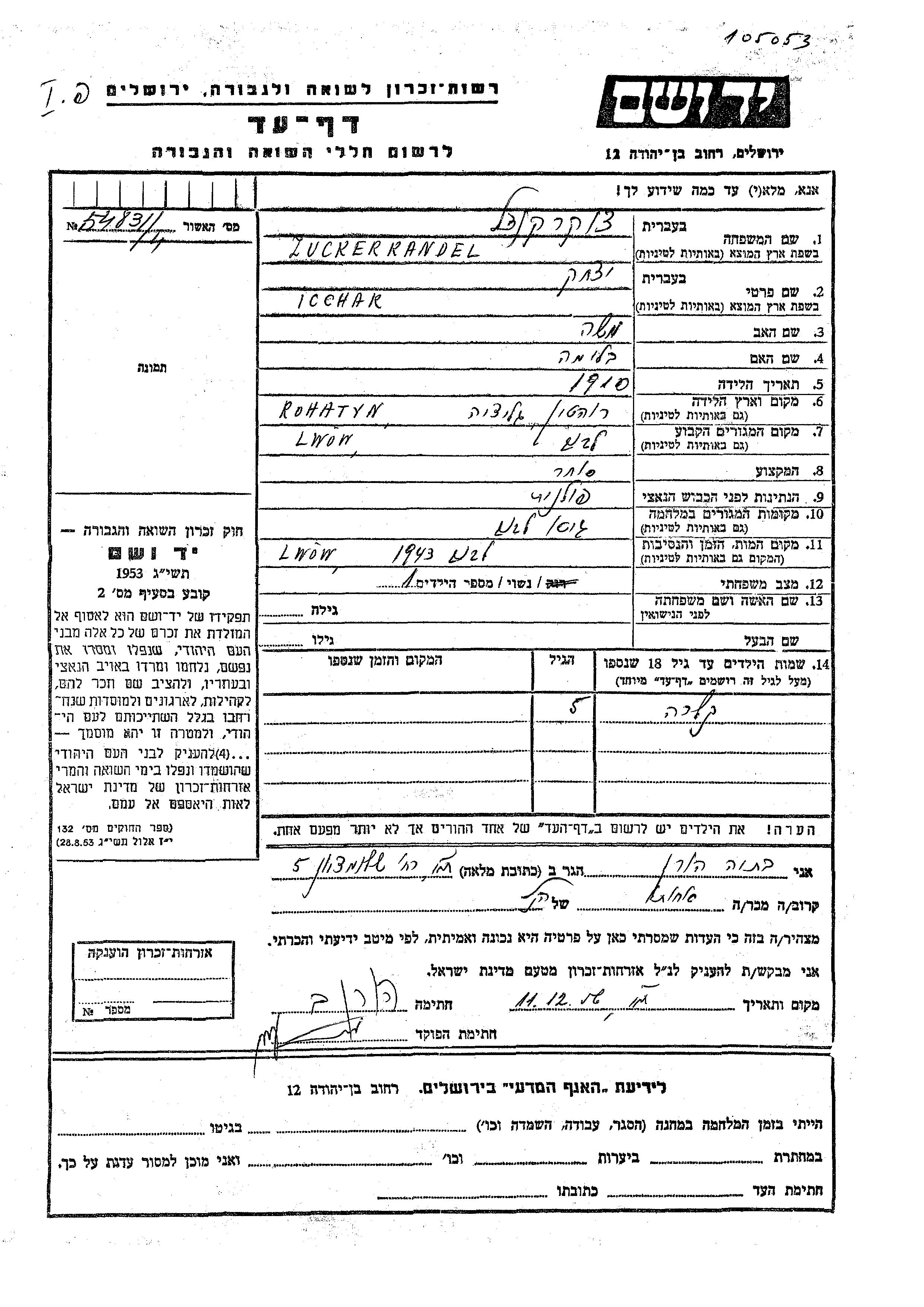 Icchak Zukerkandel wurde im Jahr 1910 in Rohatyn, Polen geboren. Er war der Sohn von Moshe und Bluma. Er war Kaufmann/-frau und Verheiratet. Vor dem Zweiten Weltkrieg lebte er in Lwow, Polen. Während des Krieges war er in Lwow, Polen.