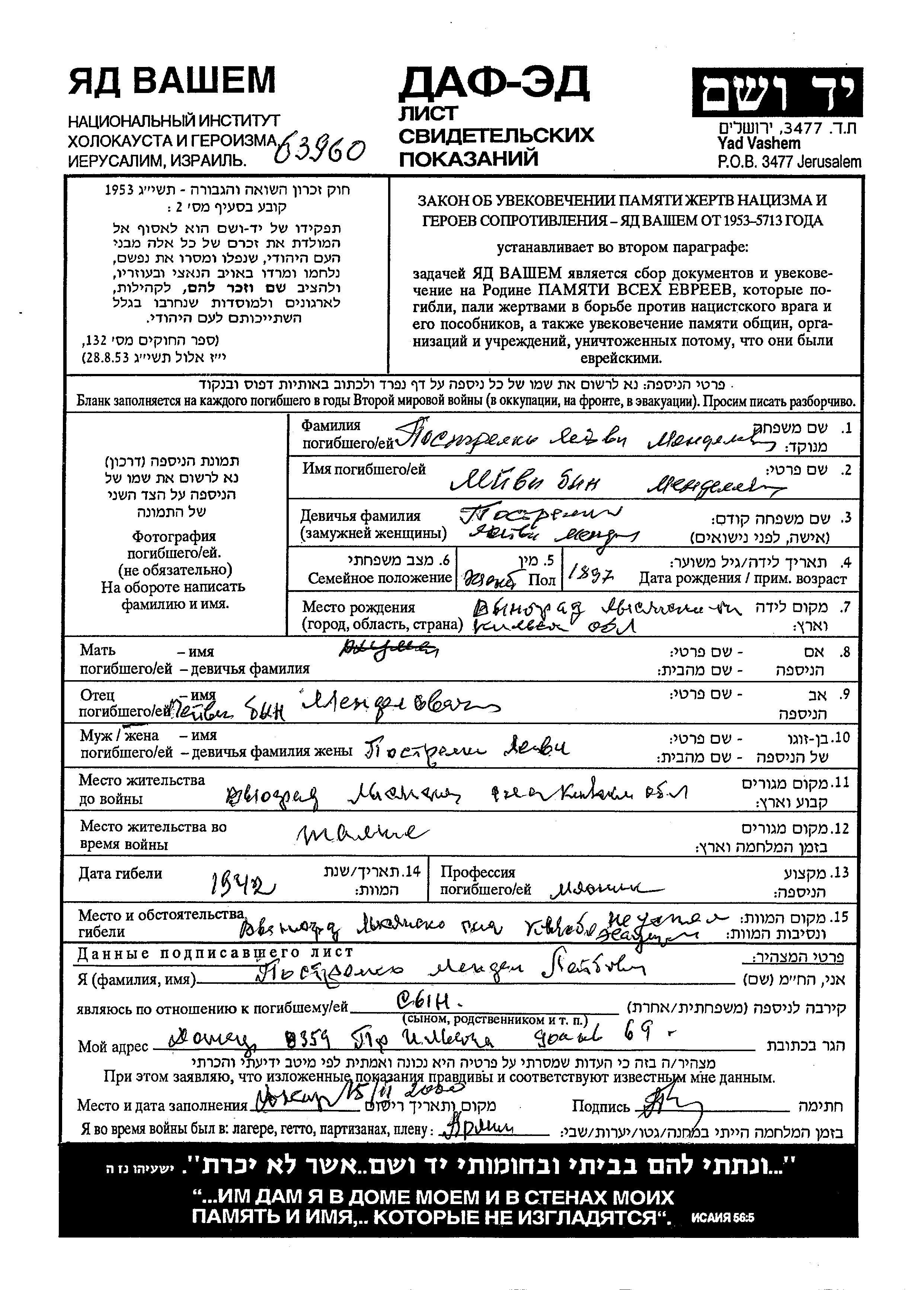 Leiba Postrelko wurde im Jahr 1897 in Vinograd, Ukraine (UdSSR) geboren. Er war Metzger/-in und Verheiratet. Vor dem Zweiten Weltkrieg lebte er in Vinograd, Ukraine (UdSSR). Während des Krieges war er in Vinograd, Ukraine (UdSSR).