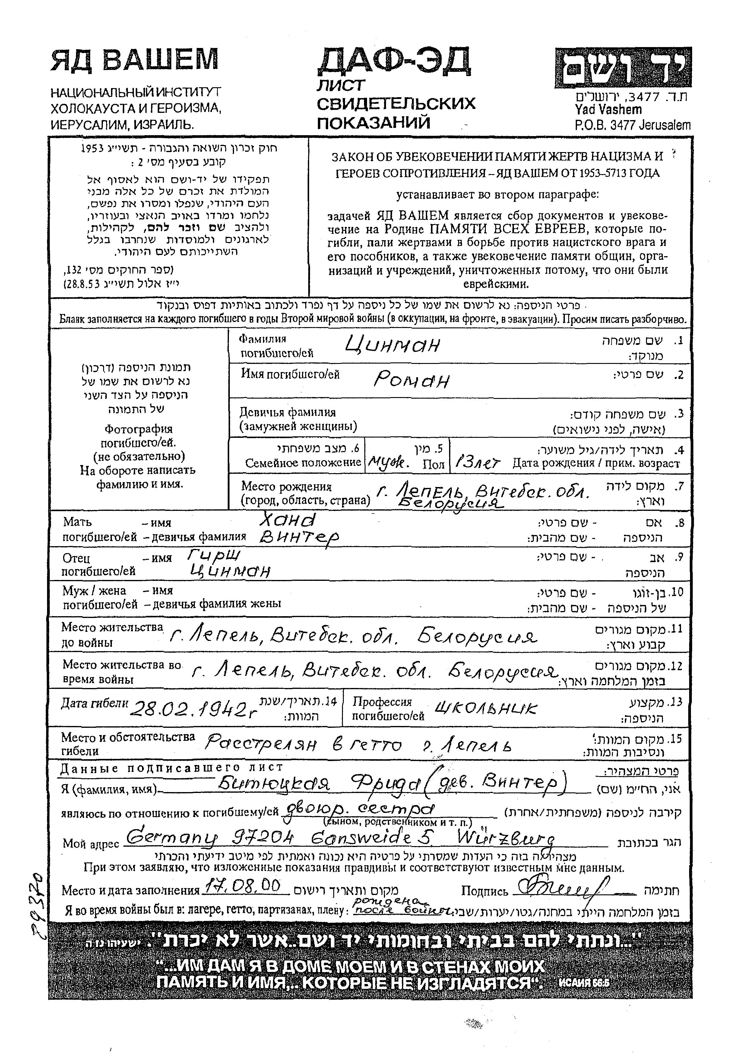 Roman Tzinman wurde in Lepel, Weißrussland (UdSSR) geboren. Er war der Sohn von Hirsh und Khana. Er war Schüler/-in und Kind. Vor dem Zweiten Weltkrieg lebte er in Lepel, Weißrussland (UdSSR). Während des Krieges war er in Lepel, Weißrussland (UdSSR).