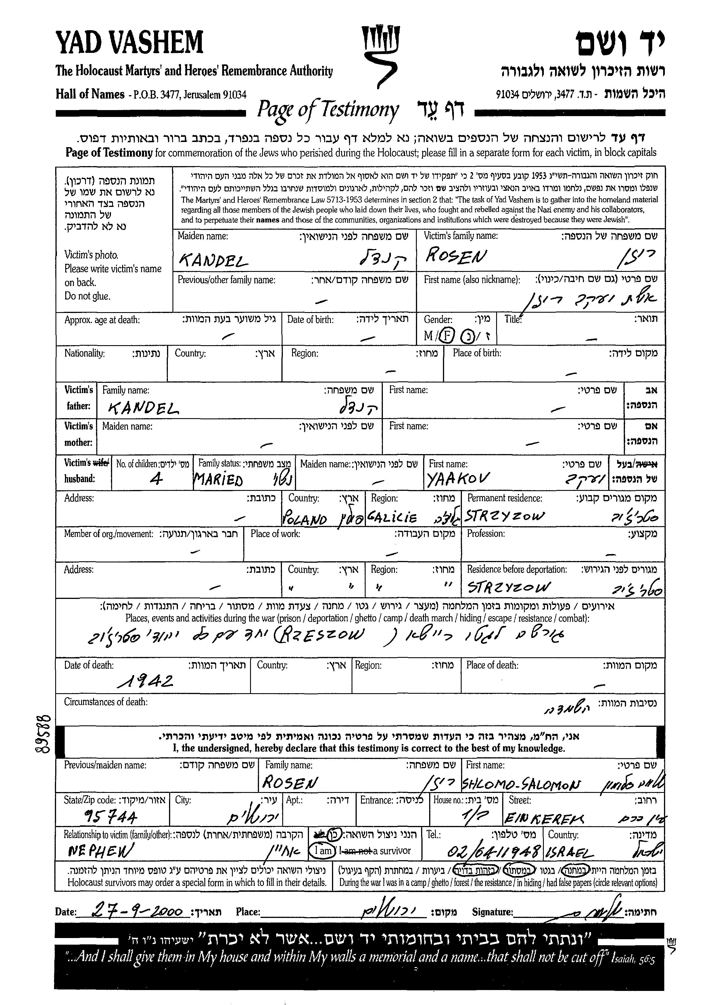 Vorname unbekannt Rosen, geb. Kandel. Sie war mit Yaakov Verheiratet. Vor dem Zweiten Weltkrieg lebte sie in Strzyzow nad Wislokiem, Polen. Während des Krieges war sie in Strzyzow nad Wislokiem, Polen.
