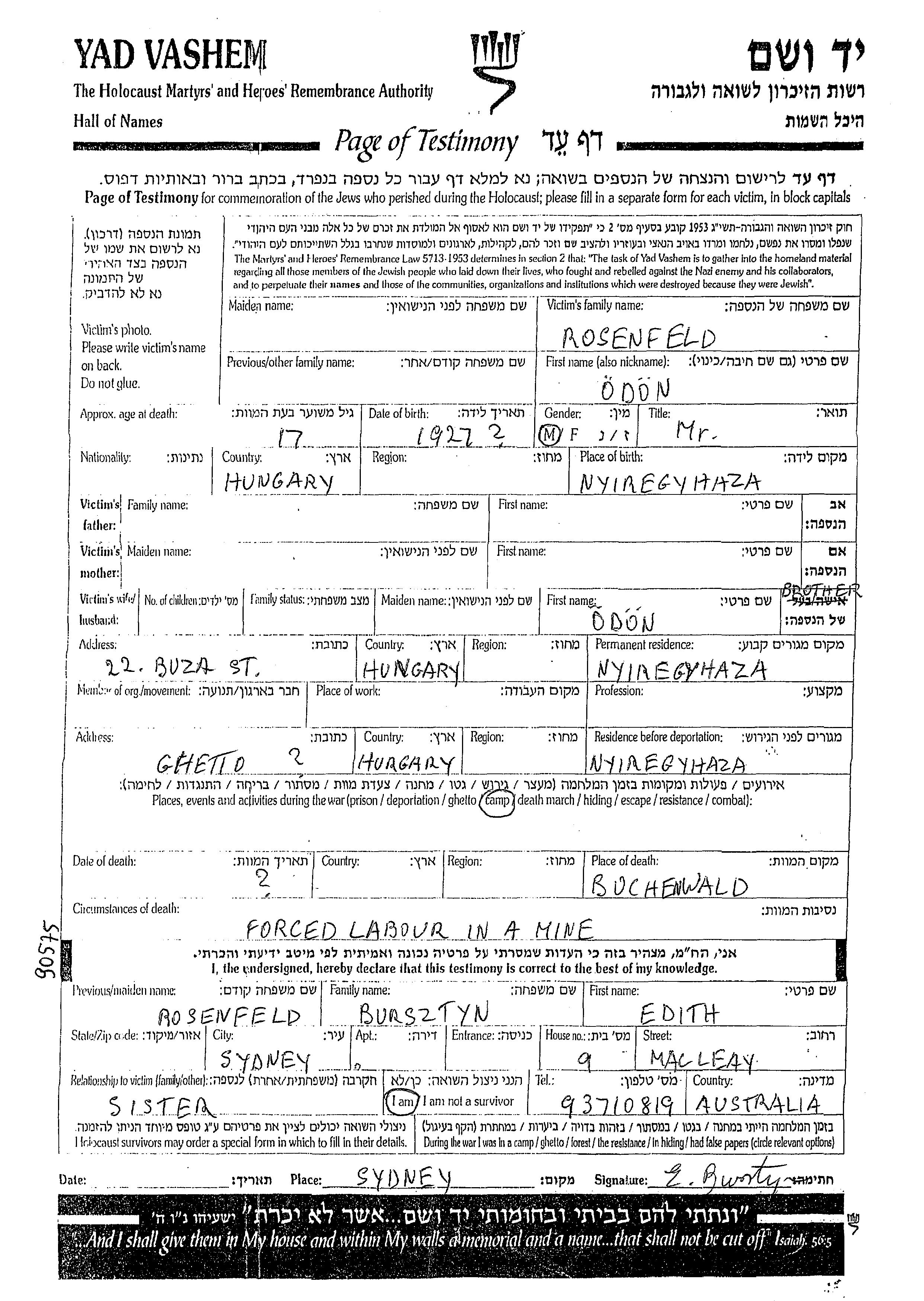 Odon Rosenfeld wurde im Jahr 1927 in Nyiregyhaza, Ungarn geboren. Vor dem Zweiten Weltkrieg lebte er in Nyiregyhaza, Ungarn. Während des Krieges war er in Nyiregyhaza, Ungarn.
