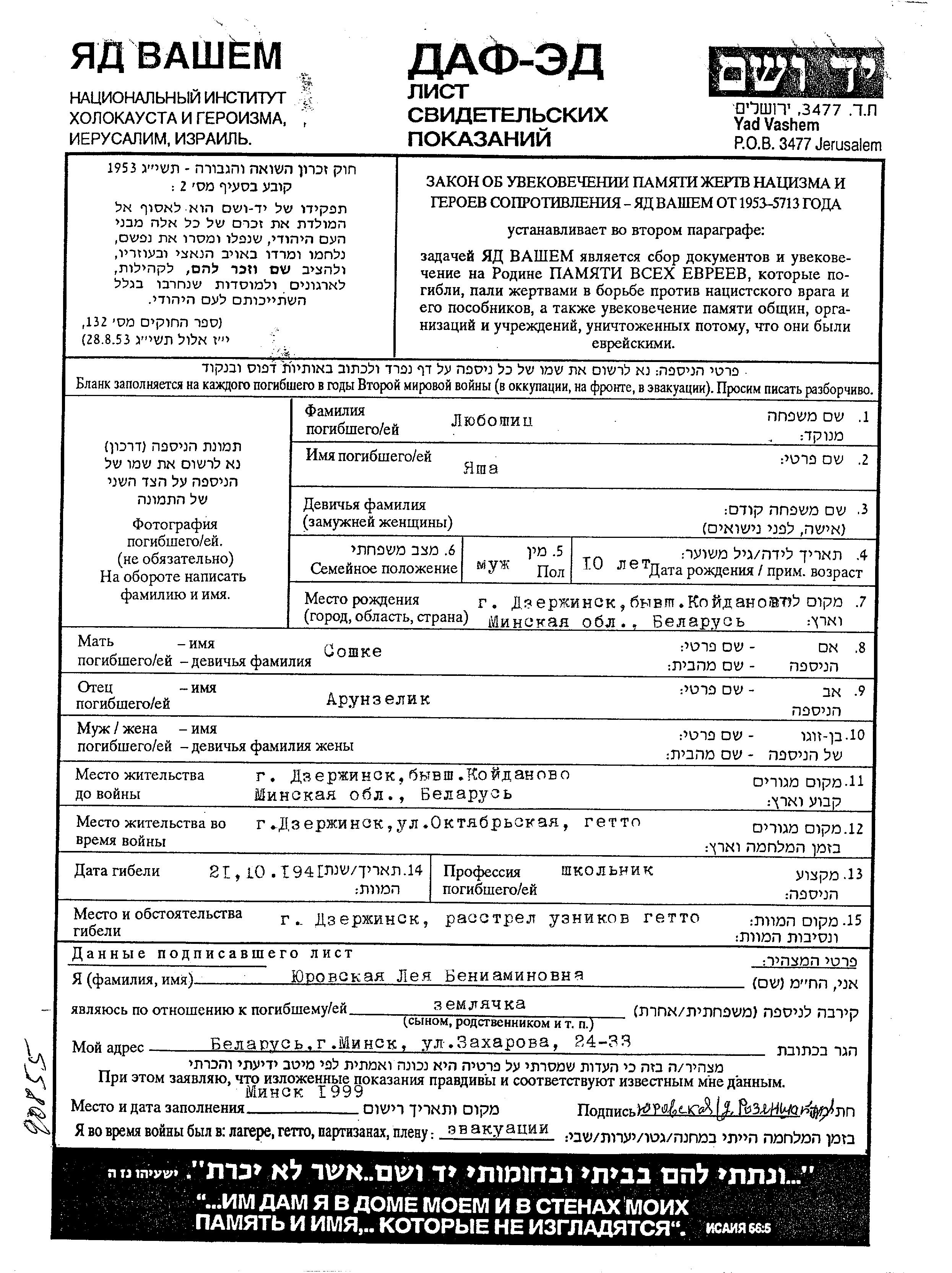 Yasha Lyuboshitz wurde in Dzerzhinsk, Weißrussland (UdSSR) geboren. Er war der Sohn von Arunzelik und Soshke. Er war Schüler/-in und Kind. Vor dem Zweiten Weltkrieg lebte er in Dzerzhinsk, Weißrussland (UdSSR). Während des Krieges war er in Dzerzhinsk, Weißrussland (UdSSR).