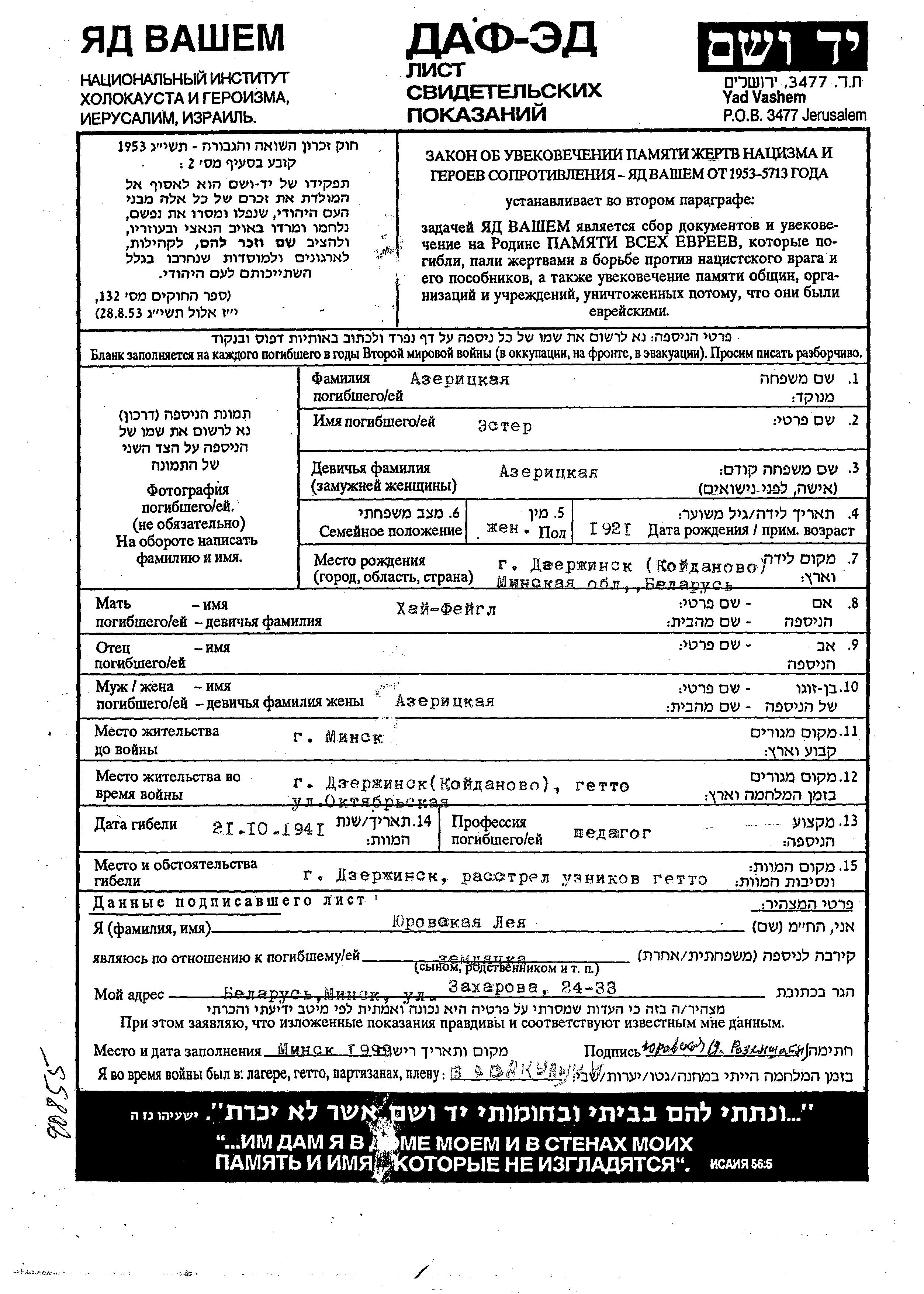 Ester Azeritzkaya wurde im Jahr 1921 in Dzerzhinsk, Weißrussland (UdSSR) geboren. Sie war die Tochter von Feigel Khai. Vor dem Zweiten Weltkrieg lebte sie in Minsk, Weißrussland (UdSSR). Während des Krieges war sie in Dzerzhinsk, Weißrussland (UdSSR).