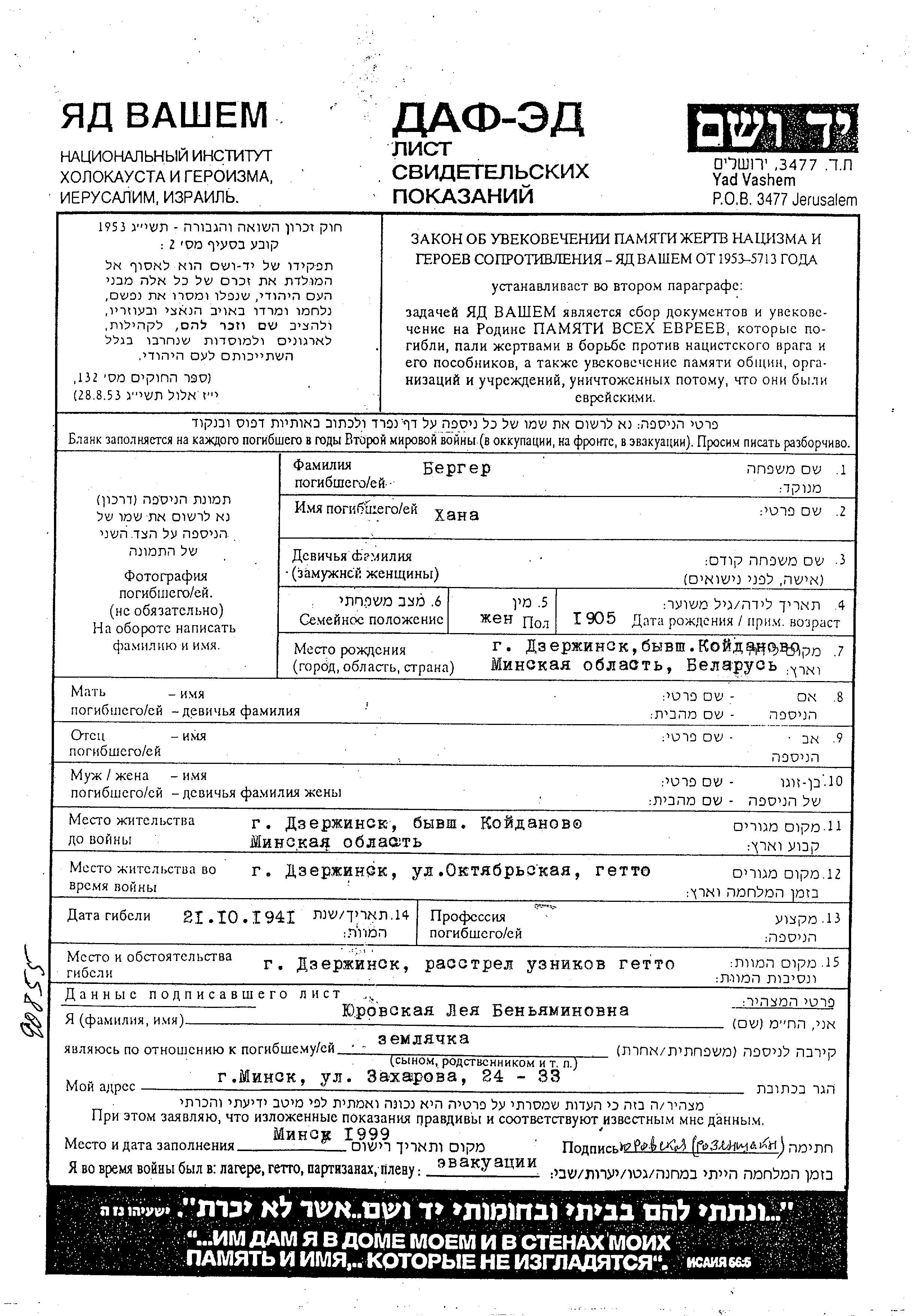 Khana Berger wurde im Jahr 1905 in Dzerzhinsk, Weißrussland (UdSSR) geboren. Vor dem Zweiten Weltkrieg lebte sie in Dzerzhinsk, Weißrussland (UdSSR). Während des Krieges war sie in Dzerzhinsk, Weißrussland (UdSSR).