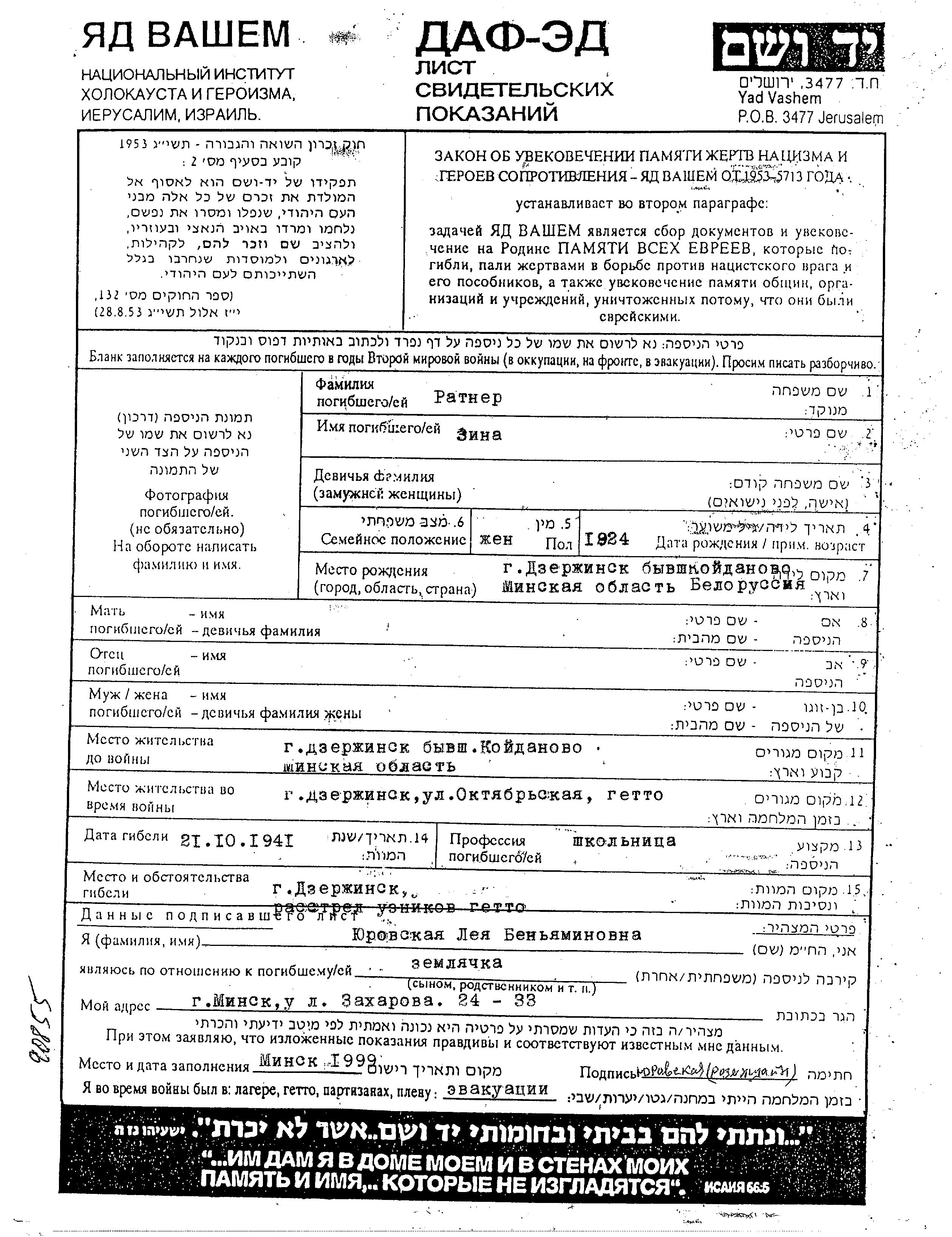 Zina Ratner wurde im Jahr 1924 in Dzerzhinsk, Weißrussland (UdSSR) geboren. Sie war Schüler/-in und Kind. Vor dem Zweiten Weltkrieg lebte sie in Dzerzhinsk, Weißrussland (UdSSR). Während des Krieges war sie in Dzerzhinsk, Weißrussland (UdSSR).