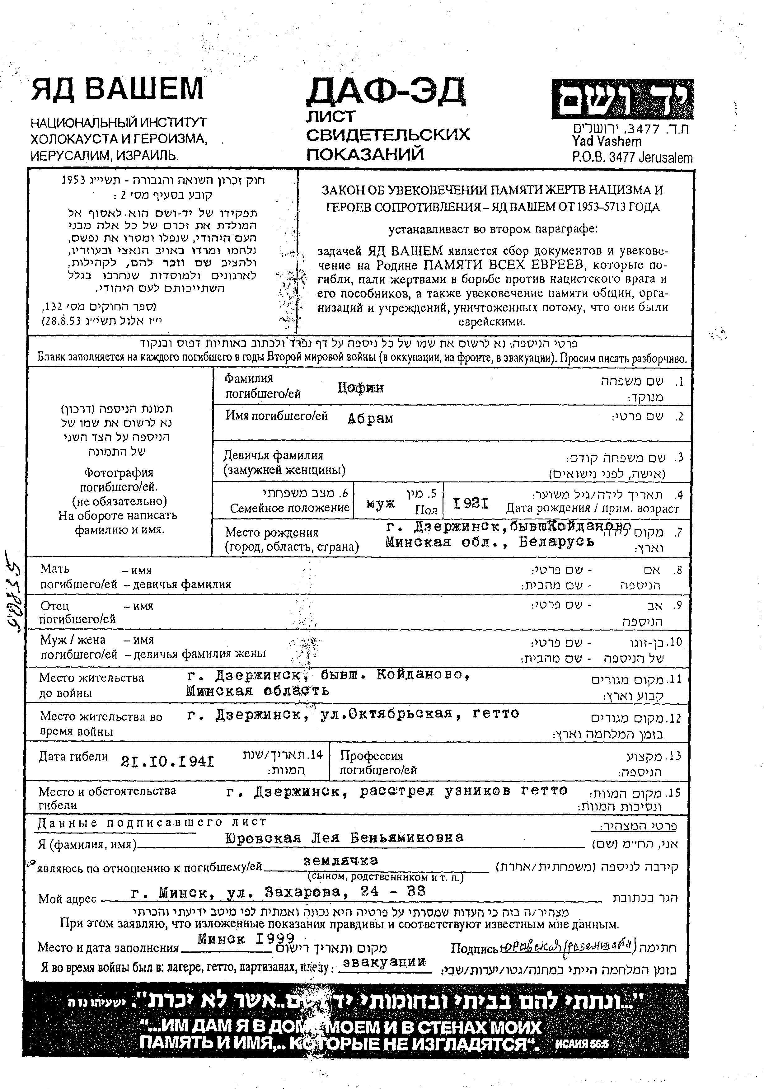 Tzofin Abram 1921 Dzerzhinsk, Weißrussland (UdSSR) Gedenkblatt