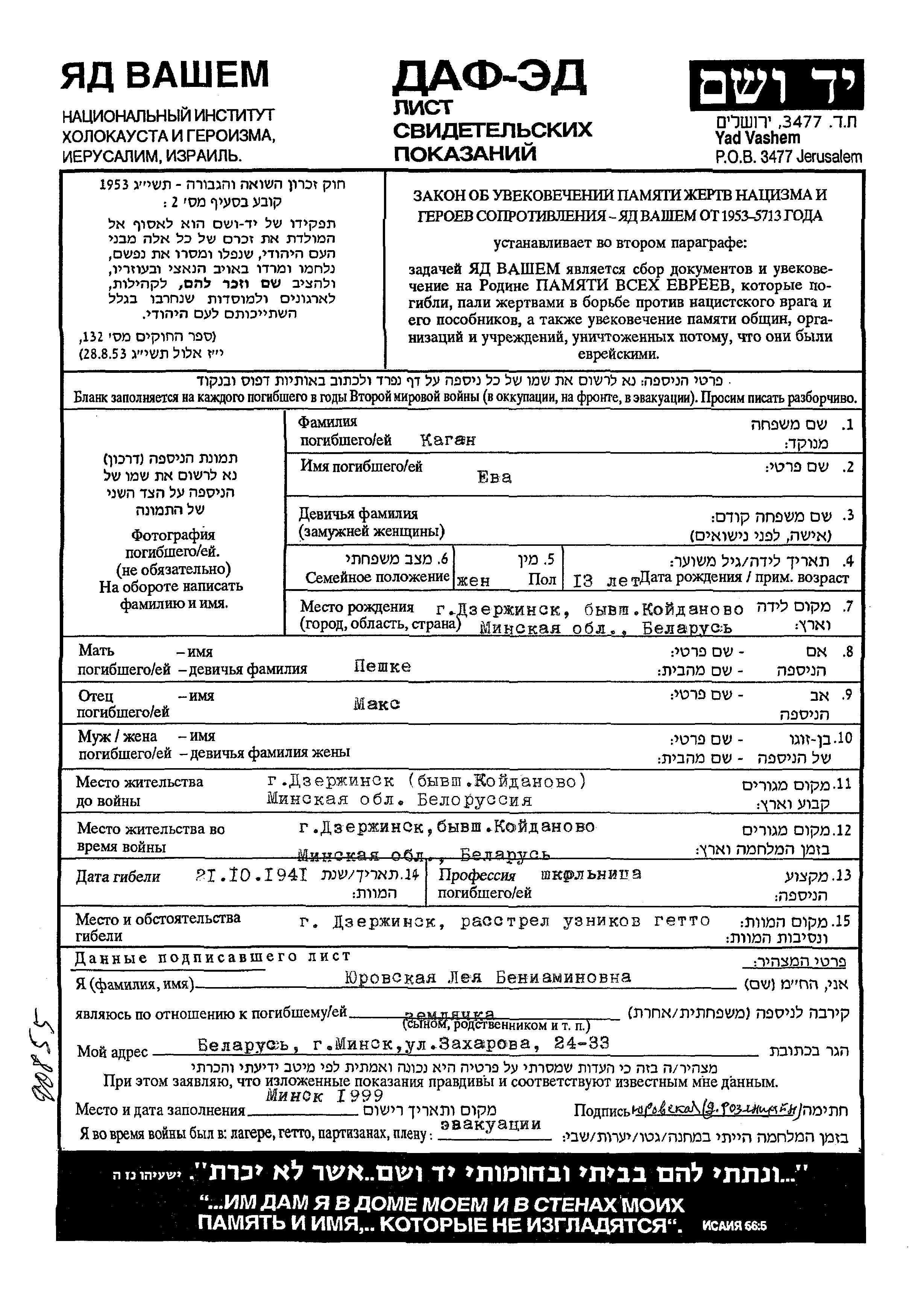 Yeva wurde in der Schoah ermordet. Todesort: Dzerzhinsk, Weißrussland (UdSSR) im Jahr 1941.