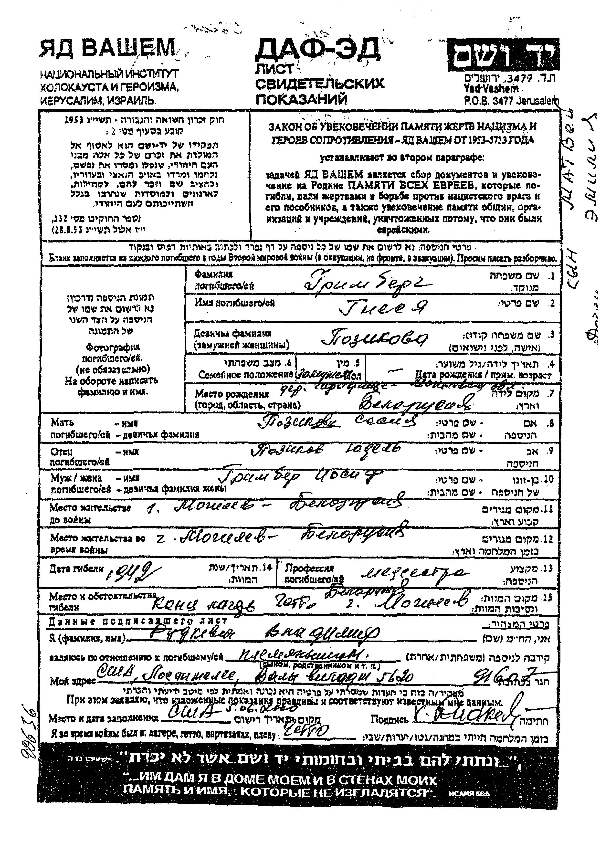 Gnesya Grimberg, geb. Pozikova wurde in Gorodishche, Weißrussland (UdSSR) geboren. Sie war die Tochter von Yudel und Sosya. Sie war Krankenpfleger/-in und mit Iosif Verheiratet. Vor dem Zweiten Weltkrieg lebte sie in Mogilev, Weißrussland (UdSSR). Während des Krieges war sie in Mogilev, Weißrussland (UdSSR).