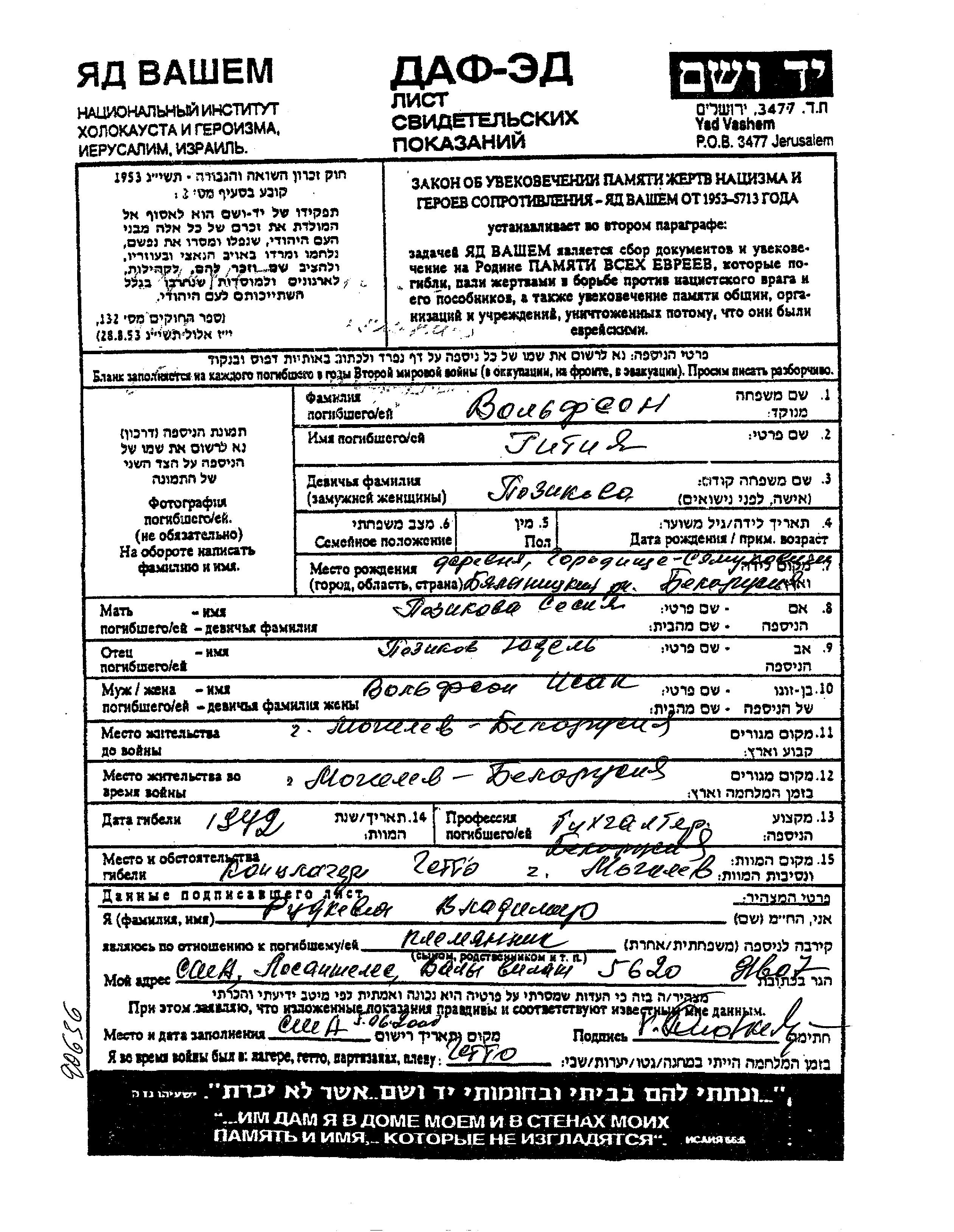 Gitia Volfson, geb. Pozikova wurde in Gorodishche, Weißrussland (UdSSR) geboren. Sie war die Tochter von Yudel und Sesil. Sie war Buchhalter/-in und mit Isak Verheiratet. Vor dem Zweiten Weltkrieg lebte sie in Mogilev, Weißrussland (UdSSR). Während des Krieges war sie in Mogilev, Weißrussland (UdSSR).