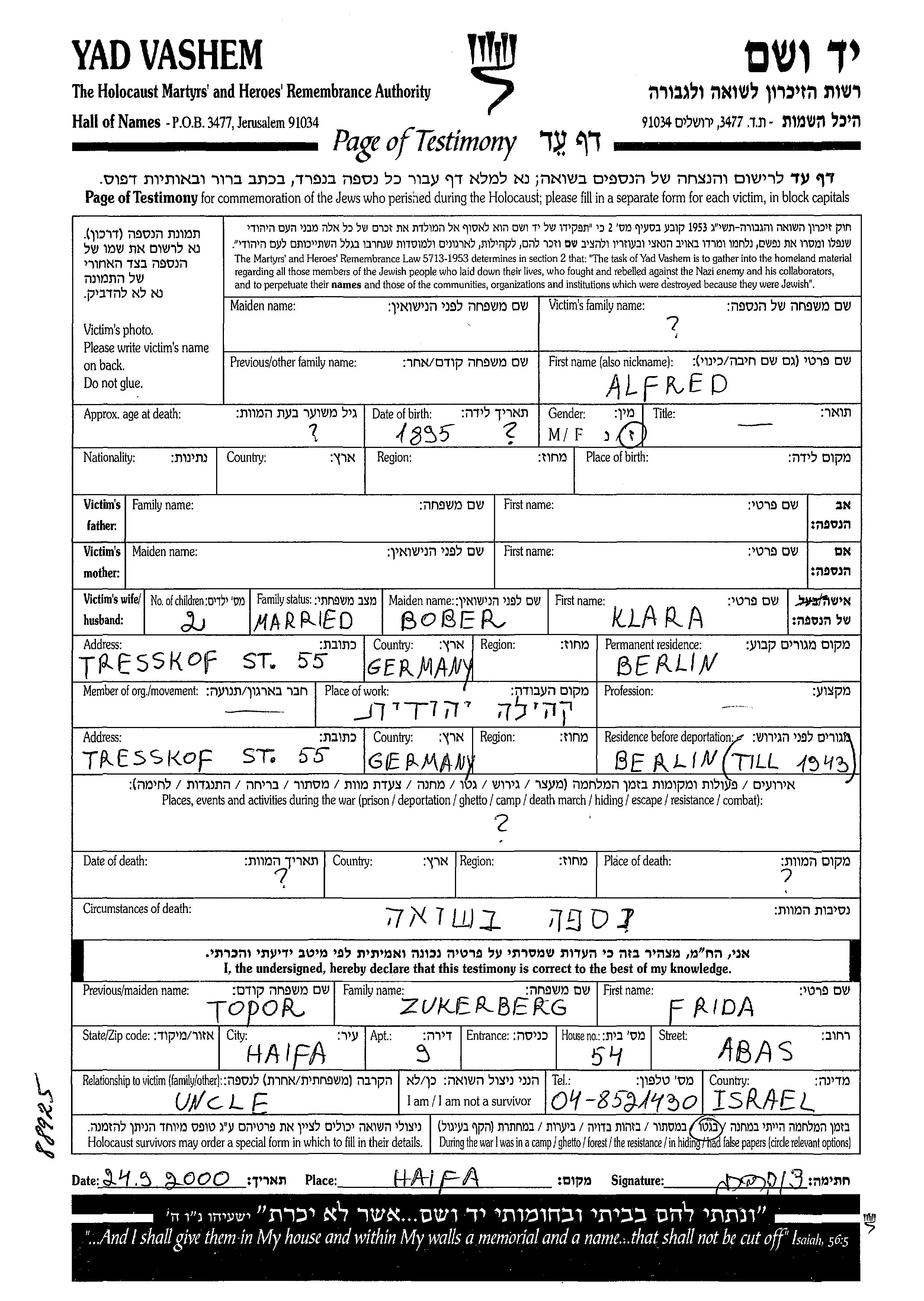 Alfred Name unbekannt wurde im Jahr 1895 geboren. Er war mit Klara, geb. Bober Verheiratet. Vor dem Zweiten Weltkrieg lebte er in Berlin, Deutsches Reich. Während des Krieges war er in Berlin, Deutsches Reich.