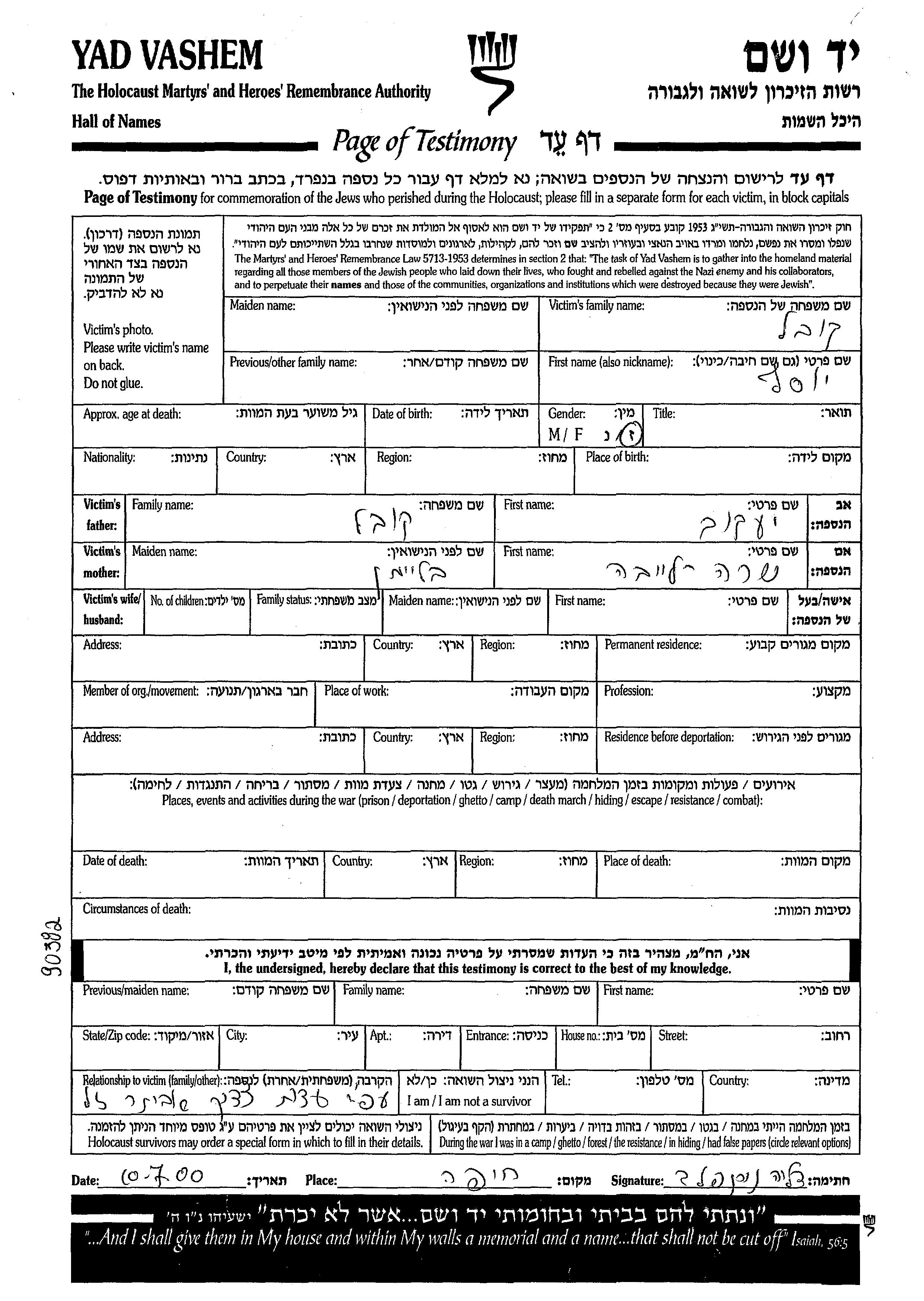Kubel Yosef unbekannter Ort, Gedenkblatt
