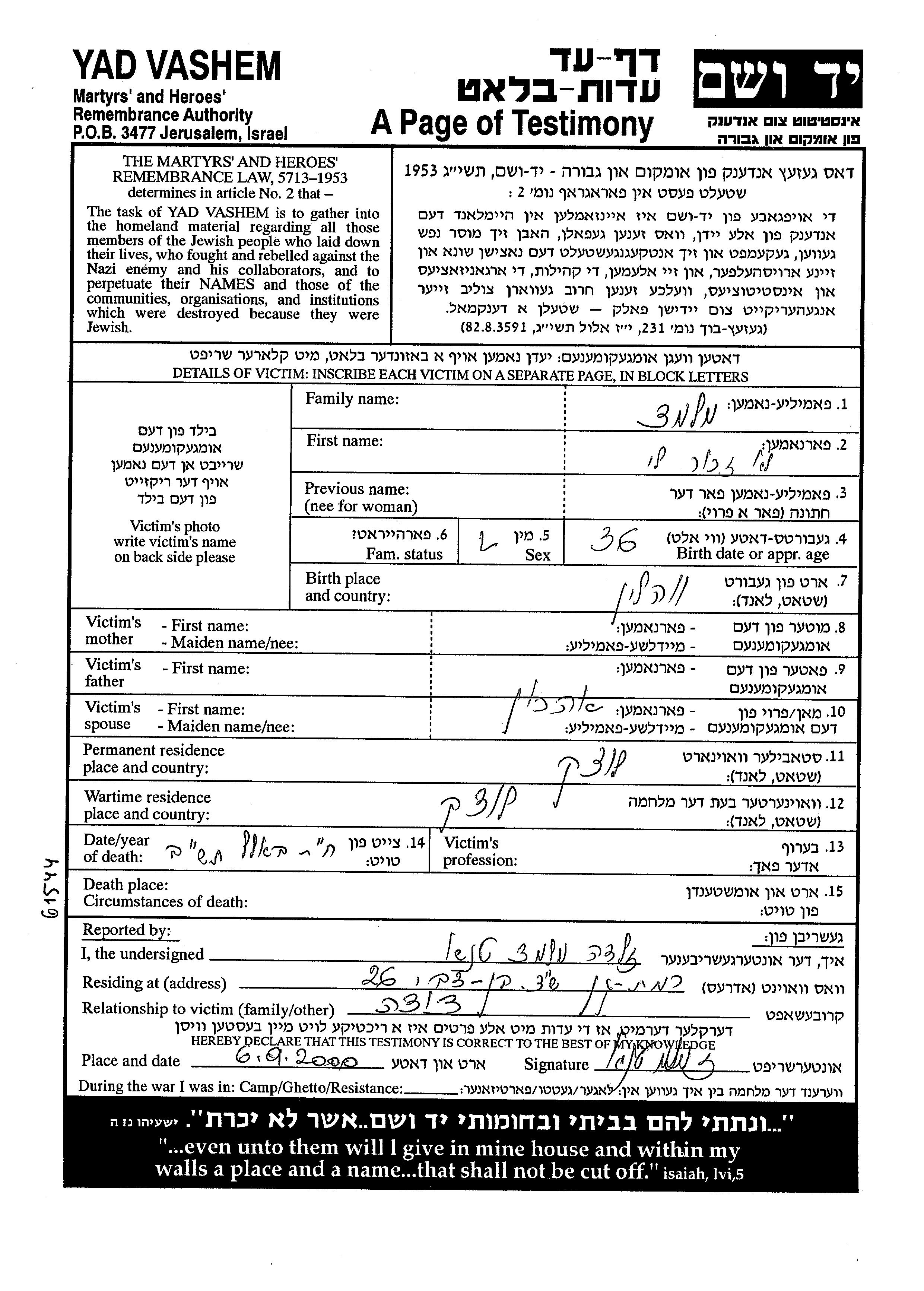 Vorname unbekannt Melamed wurde in Wolyn, Polen geboren. Er war mit Aharon Verheiratet. Vor dem Zweiten Weltkrieg lebte er in Luck, Polen. Während des Krieges war er in Luck, Polen.