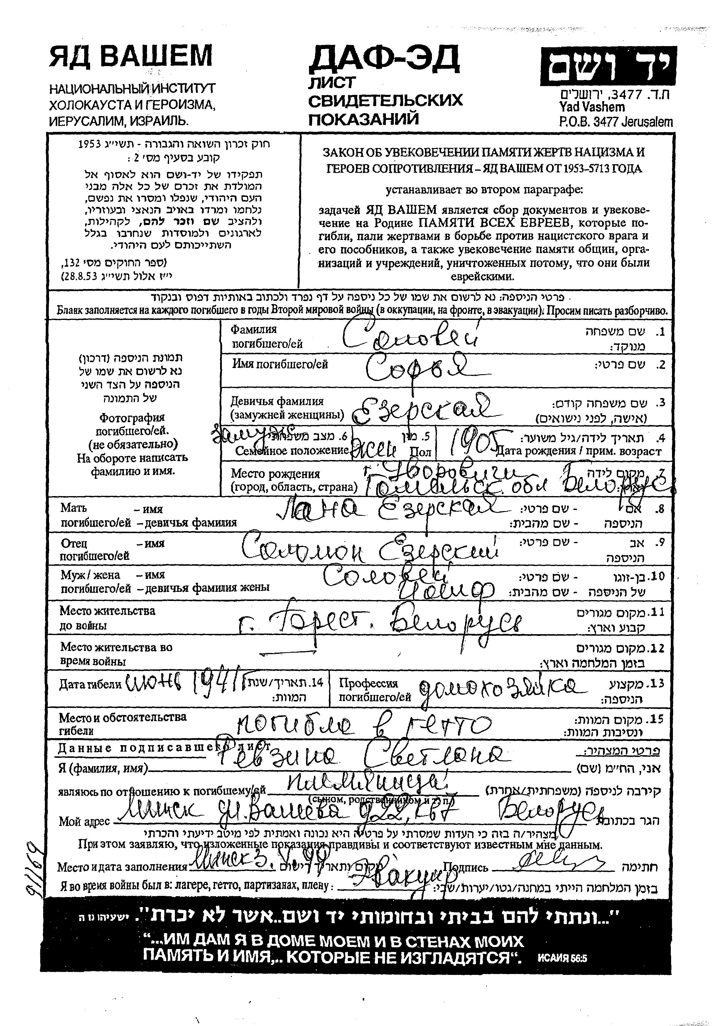 Sofia Solovei, geb. Yezerskaya wurde im Jahr 1905 in Uvarovichi, Weißrussland (UdSSR) geboren. Sie war die Tochter von Solomon und Lana. Sie war Hausfrau und mit Iosif Verheiratet. Vor dem Zweiten Weltkrieg lebte sie in Brest, Polen. Während des Krieges war sie in Brest, Polen.